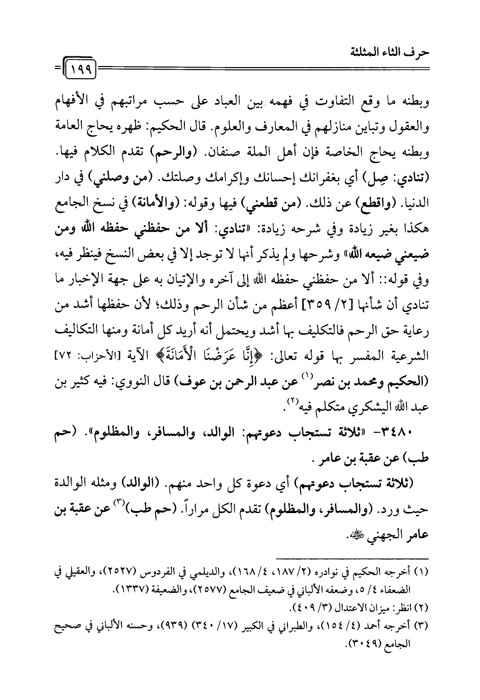 وبطنه ما وقع التفاوت في فهمه بين العباد على حسب مراتبهم في الأفهام والعقول وتباين منازلهم في المعارف والعلوم. قال الحكيم: ظهره يحاج العامة وبطنه يحاج الخاصة فإن أهل الملة صنفان. (والرحم) تقدم الكلام فيها. (تنادي: صِل) أي بغفرانك إحسانك وإكرامك وصلتك. (من وصلني) في دار الدنيا. (واقطع) عن ذلك. (من قطعني) فيها وقوله: (والأمانة) في نسخ الجامع هكذا بغير زيادة وفي شرحه زيادة: "تنادي: ألا من حفظني حفظه الله ومن ضيعني ضيعه الله" وشرحها ولم يذكر أنها لا توجد إلا في بعض النسخ فينظر فيه، وفي قوله: ألا من حفظني حفظه الله إلى آخره والإتيان به على جهة الإخبار ما تنادي أن شأنها [2/ 359] أعظم من شأن الرحم وذلك؛ لأن حفظها أشد من رعاية حق الرحم فالتكليف بها أشد ويحتمل أنه أريد كل أمانة ومنها التكاليف الشرعية المفسر بها قوله تعالى: {إِنَّا عَرَضْنَا الْأَمَانَةَ} الآية [الأحزاب: 72] (الحكيم ومحمد بن نصر (¬1) عن عبد الرحمن بن عوف) قال النووي: فيه كثير بن عبد الله اليشكري متكلم فيه (¬2).
