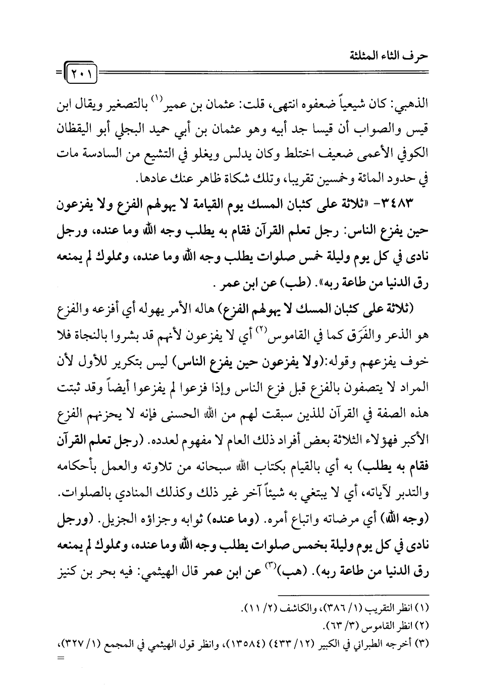 3483 - "ثلاثة على كثبان المسك يوم القيامة لا يهولهم الفزع ولا يفزعون حين يفزع الناس: رجل تعلم القرآن فقام به يطلب وجه الله وما عنده، ورجل نادى في كل يوم وليلة خمس صلوات يطلب وجه الله وما عنده، ومملوك لم يمنعه رق الدنيا من طاعة ربه". (طب) عن ابن عمر.