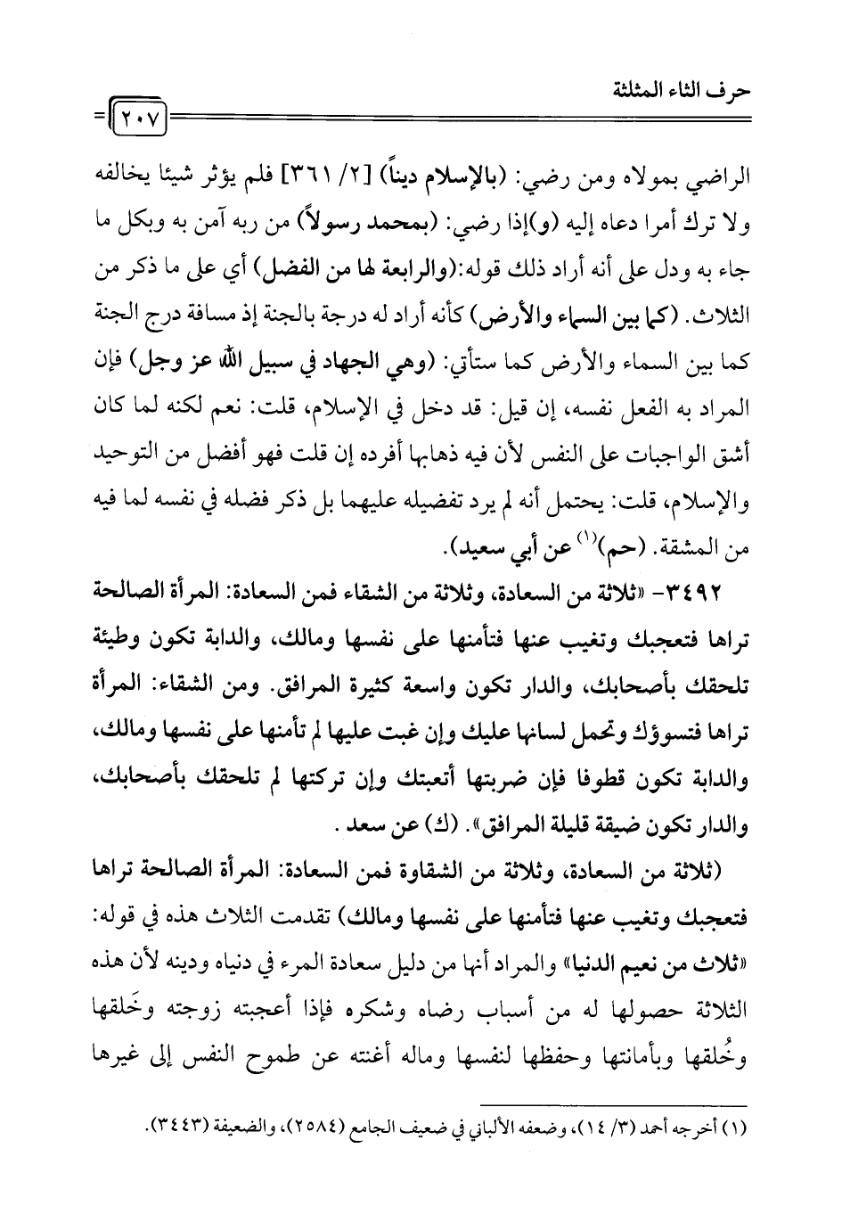 3492 - "ثلاثة من السعادة، وثلاثة من الشقاء فمن السعادة: المرأة الصالحة تراها فتعجبك وتغيب عنها فتأمنها على نفسها ومالك، والدابة تكون وطيئة تلحقك بأصحابك، والدار تكون واسعة كثيرة المرافق. ومن الشقاء: المرأة تراها فتسوؤك وتحمل لسانها عليك وإن غبت عليها لم تأمنها على نفسها ومالك، والدابة تكون قطوفا فإن ضربتها أتعبتك وإن تركتها لم تلحقك بأصحابك، والدار تكون ضيقة قليلة المرافق". (ك) عن سعد.