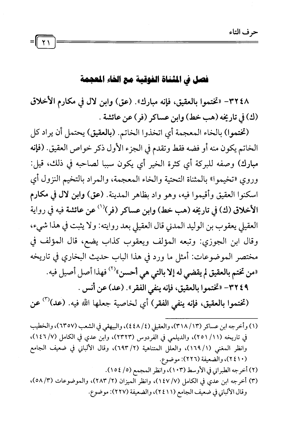 3248 - " تختموا بالعقيق، فإنه مبارك". (عن) وابن لال في مكارم الأخلاق (ك) في تاريخه (هب خط) وابن عساكر (فر) عن عائشة.