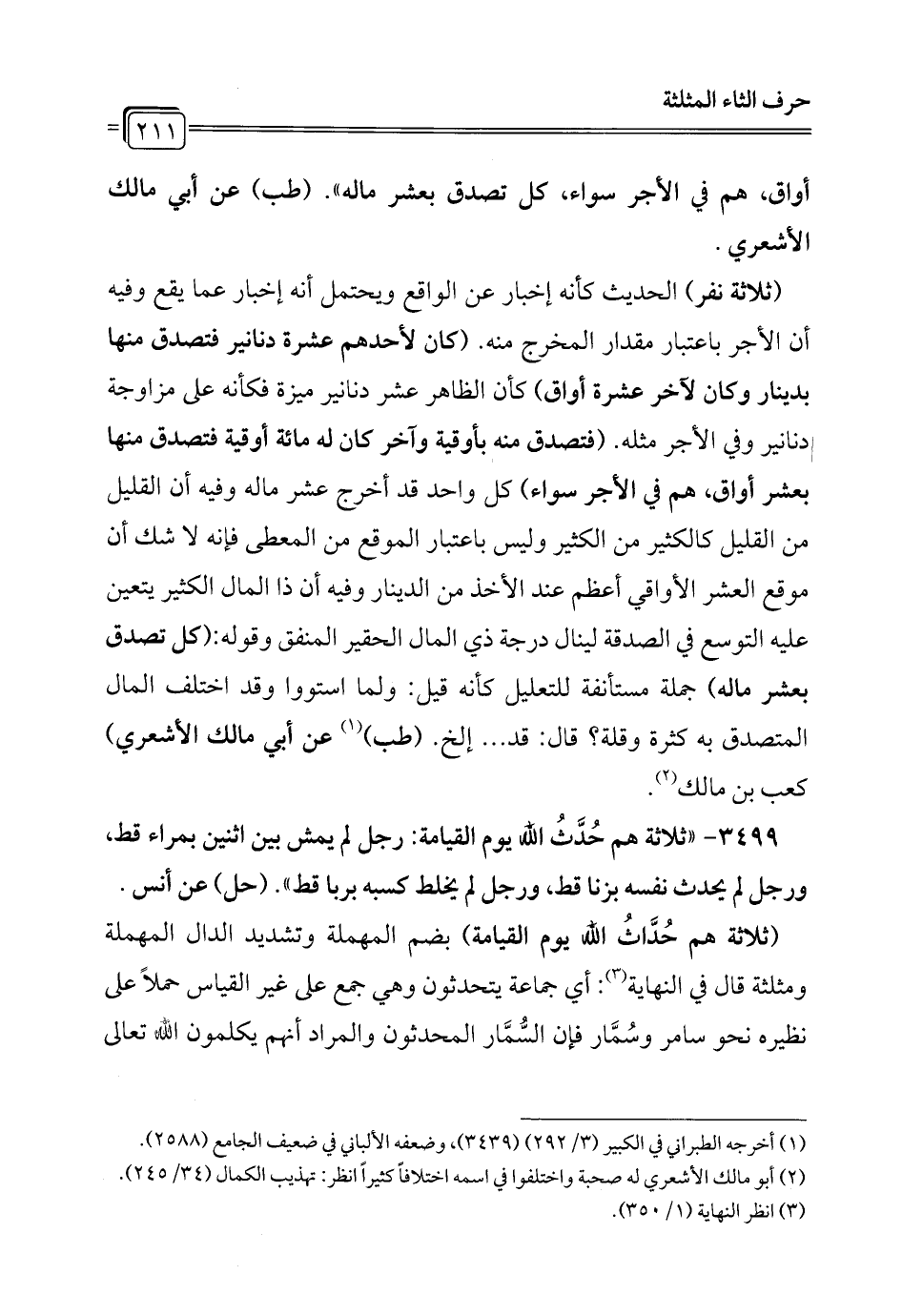 (ثلاثة نفر) الحديث كأنه إخبار عن الواقع ويحتمل أنه إخبار عما يقع وفيه أن الأجر باعتبار مقدار المخرج منه. (كان لأحدهم عشرة دنانير فتصدق منها بدينار وكان لآخر عشرة أواق) كأن الظاهر عشر دنانير ميزة فكأنه على مزاوجة دنانير وفي الأجر مثله. (فتصدق منه بأوقية وآخر كان له مائة أوقية فتصدق منها بعشر أواق، هم في الأجر سواء) كل واحد قد أخرج عشر ماله وفيه أن القليل من القليل كالكثير من الكثير وليس باعتبار الموقع من المعطى فإنه لا شك أن موقع العشر الأواقي أعظم عند الأخذ من الدينار وفيه أن ذا المال الكثير يتعين عليه التوسع في الصدقة لينال درجة ذي المال الحقير المنفق وقوله: (كل تصدق بعشر ماله) جملة مستأنفة للتعليل كأنه قيل: ولما استووا وقد اختلف المال المتصدق به كثرة وقلة؟ قال: قد ... إلخ. (طب) (¬1) عن أبي مالك الأشعري) كعب بن مالك (¬2).