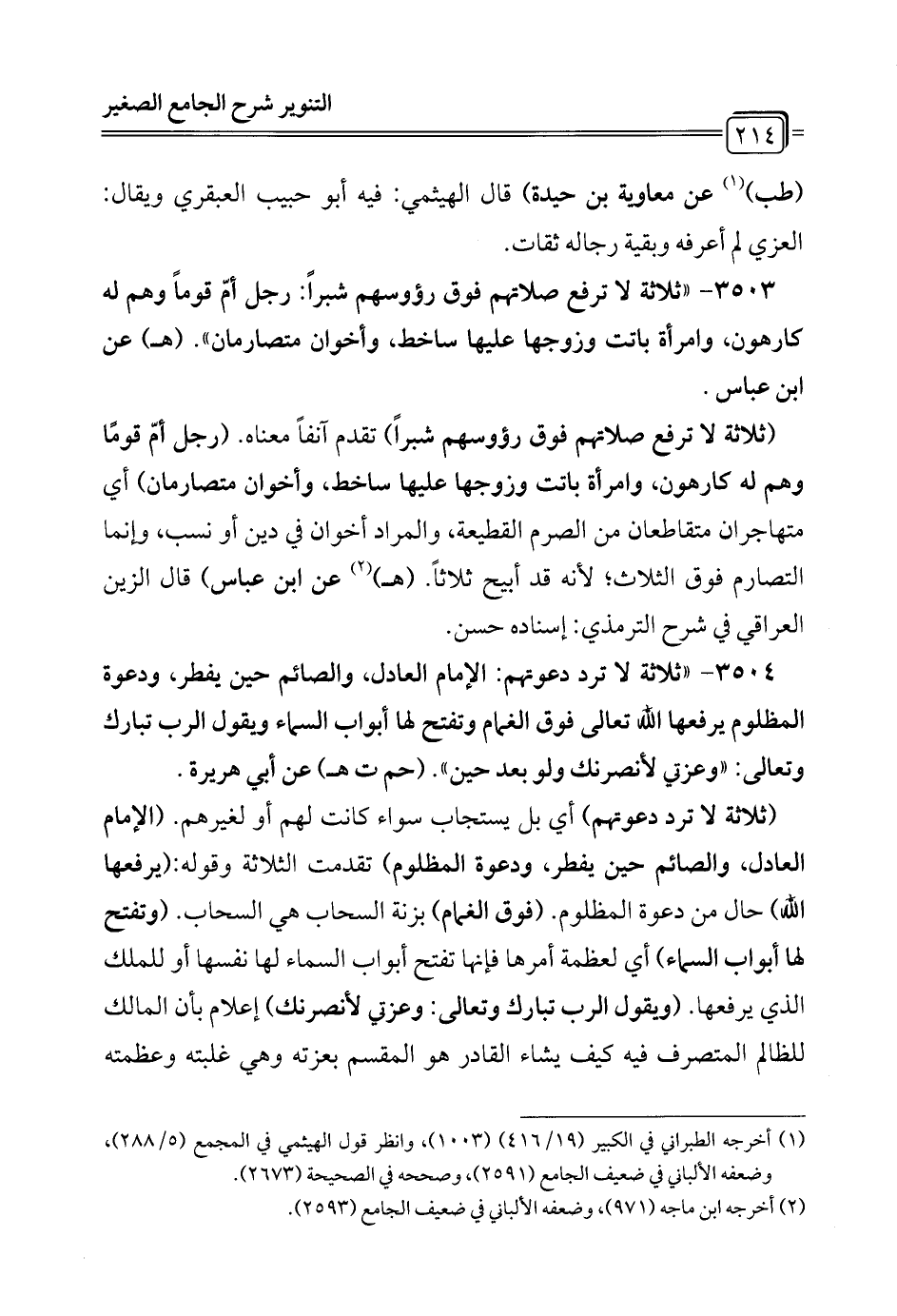 3503 - "ثلاثة لا ترفع صلاتهم فوق رؤوسهم شبراً: رجل أمّ قوماً وهم له كارهون، وامرأة باتت وزوجها عليها ساخط، وأخوان متصارمان". (هـ) عن ابن عباس.