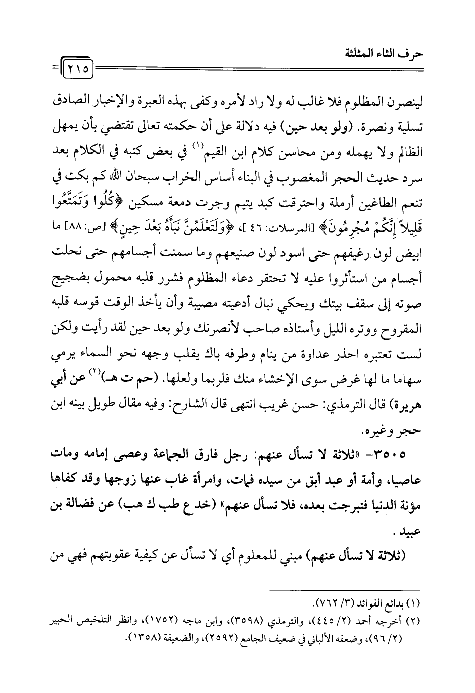 لينصرن المظلوم فلا غالب له ولا راد لأمره وكفى بهذه العبرة والإخبار الصادق تسلية ونصرة. (ولو بعد حين) فيه دلالة على أن حكمته تعالى تقتضي بأن يمهل الظالم ولا يهمله ومن محاسن كلام ابن القيم (¬1) في بعض كتبه في الكلام بعد سرد حديث الحجر المغصوب في البناء أساس الخراب سبحان الله كم بكت في تنعم الطاغين أرملة واحترقت كبد يتيم وجرت دمعة مسكين {كُلُوا وَتَمَتَّعُوا قَلِيلًا إِنَّكُمْ مُجْرِمُونَ} [المرسلات: 46]، {وَلَتَعْلَمُنَّ نَبَأَهُ بَعْدَ حِينٍ} [ص: 88] ما ابيض لون رغيفهم حتى اسود لون صنيعهم وما سمنت أجسامهم حتى نحلت أجسام من استأثروا عليه لا تحتقر دعاء المظلوم فشرر قلبه محمول بضجيج صوته إلى سقف بيتك ويحكي نبال أدعيته مصيبة وأن يأخذ الوقت قوسه قلبه المقروح ووتره الليل وأستاذه صاحب لأنصرنك ولو بعد حين لقد رأيت ولكن لست تعتبره احذر عداوة من ينام وطرفه باك يقلب وجهه نحو السماء يرمي سهاما ما لها غرض سوى الإخشاء منك فلربما ولعلها. (حم ت هـ) (¬2) عن أبي هريرة) قال الترمذي: حسن غريب انتهى قال الشارح: وفيه مقال طويل بينه ابن حجر وغيره.