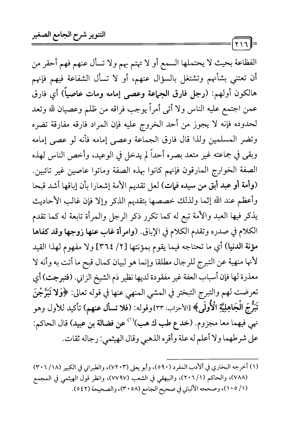 الفظاعة بحيث لا يحتملها السمع أو لا تهتم بهم ولا تسأل عنهم فهم أحقر من أن تعتني بشأنهم وتشتغل بالسؤال عنهم، أو لا تسأل الشفاعة فيهم فإنهم هالكون أولهم: (رجل فارق الجماعة وعصى إمامه ومات عاصياً) أي فارق عمن اجتمع عليه الناس ولا أتى أمراً يوجب فراقه من ظلم وعصيان لله وتعد لحدوده فإنه لا يجوز من أحد الخروج عليه فإن المراد فارقه مفارقة تضره وتضر المسلمين ولذا قال فارق الجماعة وعصى إمامه فأنه لو عصى إمامه وبقى في جماعته غير متعد بصره أحداً لم يدخل في الوعيد، وأخص الناس لهذه الصفة الخوارج المارقون فإنهم كانوا بهذه الصفة وماتوا عاصين غير تائبين. (وأمة أو عبد أبق من سيده فمات) لعل تقديم الأمة إشعارا بأن إباقها أشد قبحا وأعظم عند الله إثما ولذلك خصصها بتقديم الذكر وإلا فإن غالب الأحاديث يذكر فيها العبد والأمة تبع له كما تكرر ذكر الرجل والمرأة متابعة له كما تقدم الكلام في صدره وتقدم الكلام في الإباق. (وامرأة غاب عنها زوجها وقد كفاها مؤنة الدنيا) أي ما تحتاجه فيما يقوم بمؤنتها [2/ 364] ولا مفهوم لهذا القيد لأنها منهية عن التبرج للرجال مطلقا وإنما هو لبيان كمال قبح ما أتت به وأنه لا معذرة لها فإن أسباب العفة غير مفقودة لديها نظير ذم الشيخ الزاني. (فتبرجت) أي تعرضت لهم والتبرج التبختر في المشي المنهي عنها في قوله تعالى: {وَلَا تَبَرَّجْنَ تَبَرُّجَ الْجَاهِلِيَّةِ الْأُولَى} [الأحزاب: 33] وقوله: (فلا تسأل عنهم) تأكيد للأول وهو نهي فيهما معا مجزوم. (خد ع طب ك هب) (¬1) عن فضالة بن عبيد) قال الحاكم: على شرطهما ولا أعلم له علة وأقره الذهبي وقال الهيثمي: رجاله ثقات.