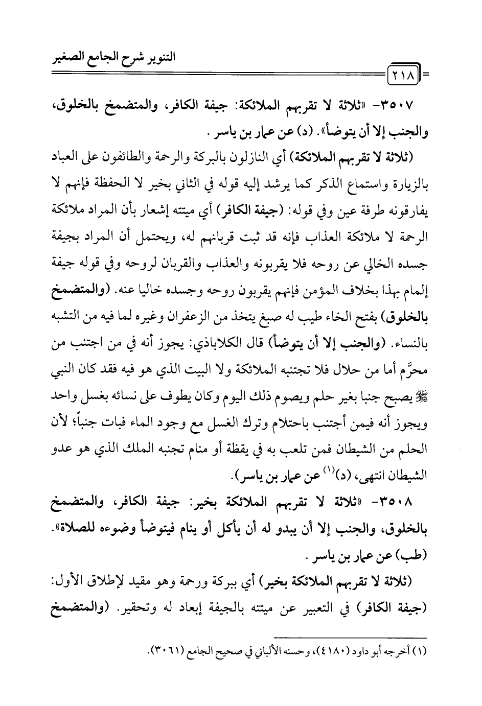 (ثلاثة لا تقربهم الملائكة) أي النازلون بالبركة والرحمة والطائفون على العباد بالزيارة واستماع الذكر كما يرشد إليه قوله في الثاني بخير لا الحفظة فإنهم لا يفارقونه طرفة عين وفي قوله: (جيفة الكافر) أي ميتته إشعار بأن المراد ملائكة الرحمة لا ملائكة العذاب فإنه قد ثبت قربانهم له، ويحتمل أن المراد بجيفة جسده الخالي عن روحه فلا يقربونه والعذاب والقربان لروحه وفي قوله جيفة إلمام بهذا بخلاف المؤمن فإنهم يقربون روحه وجسده خاليا عنه. (والمتضمخ بالخلوق) بفتح الخاء طيب له صبغ يتخذ من الزعفران وغيره لما فيه من التشبه بالنساء. (والجنب إلا أن يتوضأ) قال الكلاباذي: يجوز أنه في من اجتنب من محرَّم أما من حلال فلا تجتنبه الملائكة ولا البيت الذي هو فيه فقد كان النبي - صلى الله عليه وسلم - يصبح جنبا بغير حلم ويصوم ذلك اليوم وكان يطوف على نسائه بغسل واحد ويجوز أنه فيمن أجتنب باحتلام وترك الغسل مع وجود الماء فبات جنباً؛ لأن الحلم من الشيطان فمن تلعب به في يقظة أو منام تجنبه الملك الذي هو عدو الشيطان انتهى، (د) (¬1) عن عمار بن ياسر).