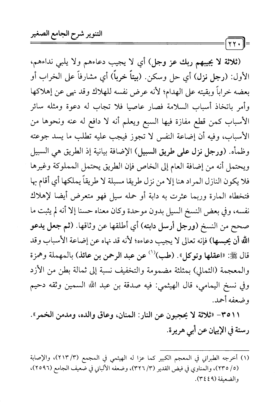 (ثلاثة لا يجيبهم ربك عز وجل) أي لا يجيب دعاءهم ولا يلبي نداءهم، الأول: (رجل نزل) أي حل وسكن. (بيتاً خرباً) أي مشارفاً على الخراب أو بعضه خراباً وبقيته على الهدام؛ لأنه عرض نفسه للهلاك وقد نهى عن إهلاكها وأمر باتخاذ أسباب السلامة فصار عاصيا فلا تجاب له دعوة ومثله سائر الأسباب كمن قطع مفازة فيها السبع ويعلم أنه لا دافع له عنه ونحوها من الأسباب، وفيه أن إضاعة النفس لا تجوز فيجب عليه تطلب ما يسد جوعته وظمأه. (ورجل نزل على طريق السبيل) الإضافة بيانية إذ الطريق هي السبيل ويحتمل أنه من إضافة العام إلى الخاص فإن الطريق يحتمل المملوكة وغيرها فلا يكون النازل المراد هنا إلا من نزل طريقا مسبلة لا طريقاً يملكها أي أقام بها فتخطاه المارة وربما عثرت به دابة أو حمله سيل فهو متعرض أيضاً لإهلاك نفسه، وفي بعض النسخ السيل بدون موحدة وكان معناه حسنا إلا أنه لم يثبت ما صحح من النسخ (ورجل أرسل دابته) أي أطلقها عن وثاقها. (ثم جعل يدعو الله أن يحبسها) فإنه تعالى لا يجيب دعاءه؛ لأنه قد نهاه عن إضاعة الأسباب وقد قال - صلى الله عليه وسلم - "اعقلها وتوكل". (طب) (¬1) عن عبد الرحمن بن عائذ) بالمهملة وهمزة والمعجمة (الثمالي) بمثلثة مضمومة والتخفيف نسبة إلى ثمالة بطن من الأزد وفي نسخ اليمامي، قال الهيثمي: فيه صدقة بن عبد الله السمين وثقه دحيم وضعفه أحمد.