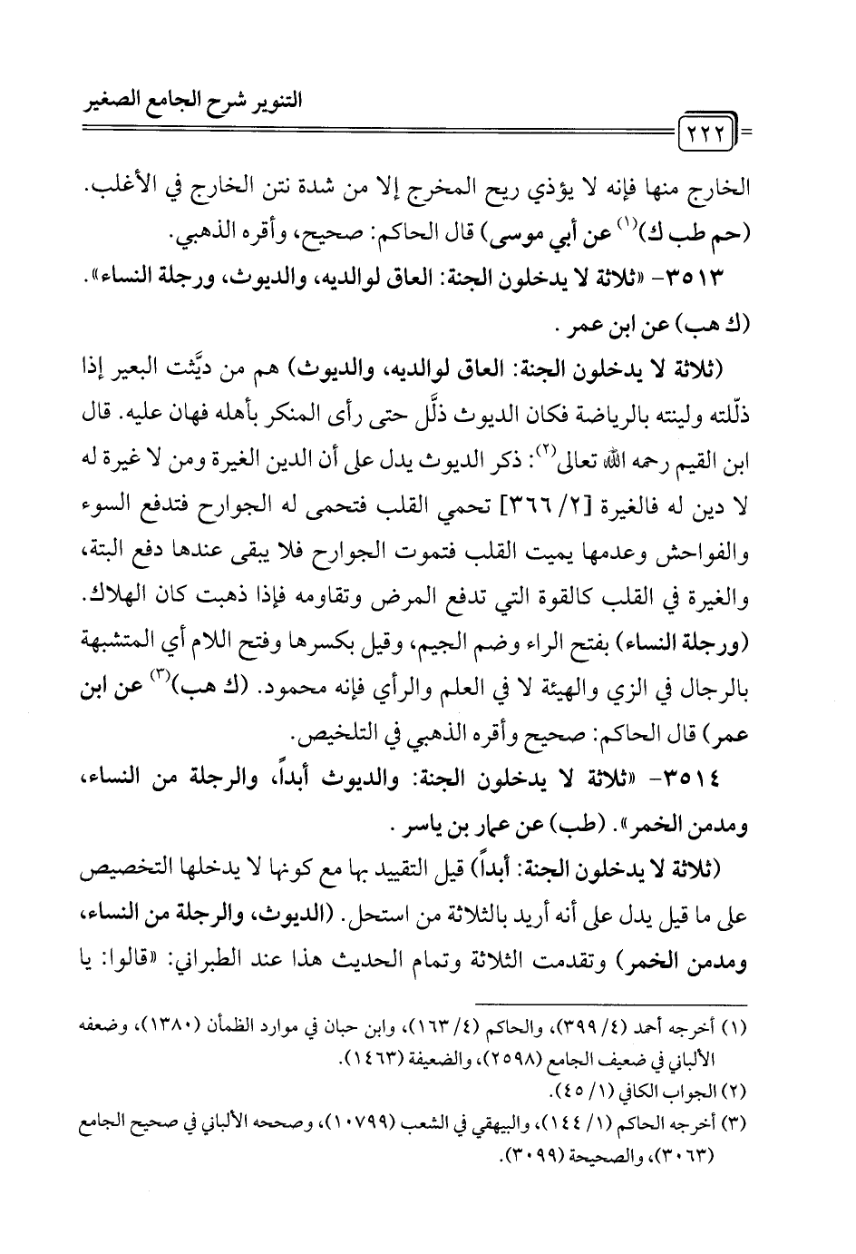 3513 - "ثلاثة لا يدخلون الجنة: العاق لوالديه، والديوث، ورجلة النساء". (ك هب) عن ابن عمر.