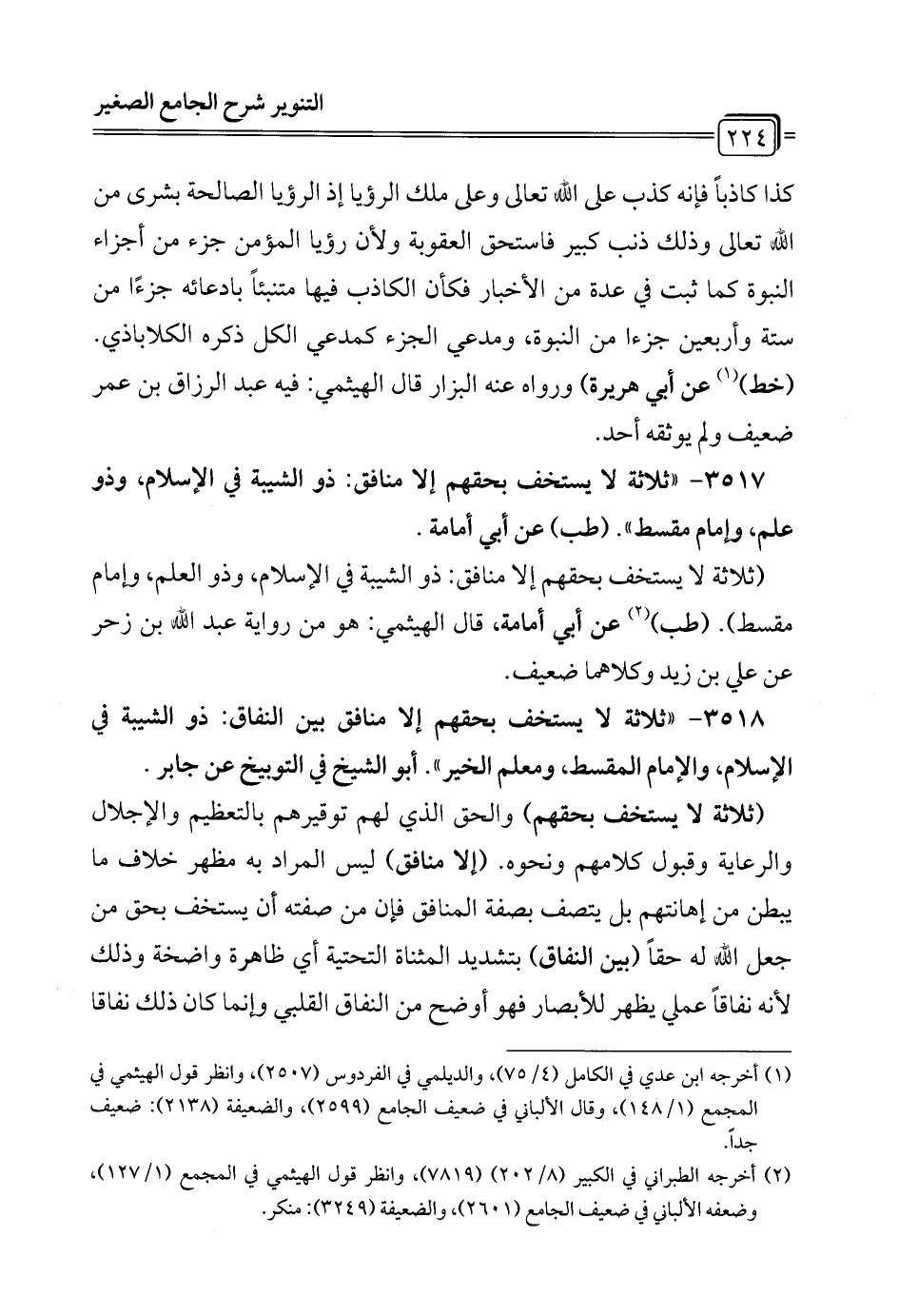3518 - "ثلاثة لا يستخف بحقهم إلا منافق بين النفاق: ذو الشيبة في الإسلام، والإمام المقسط، ومعلم الخير". أبو الشيخ في التوبيخ عن جابر.