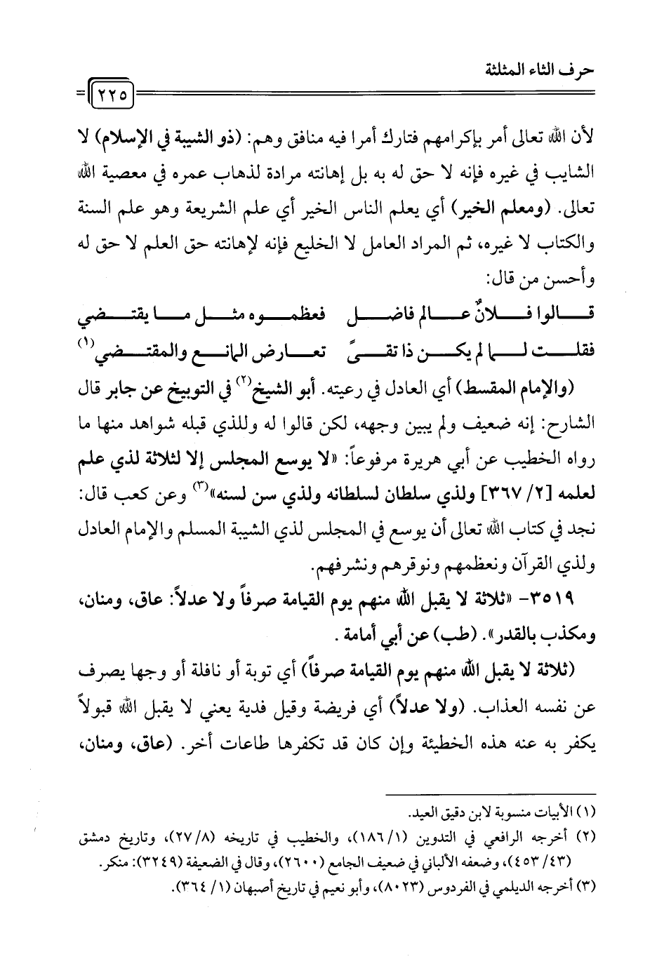 3519 - "ثلاثة لا يقبل الله منهم يوم القيامة صرفاً ولا عدلاً: عاق، ومنان، ومكذب بالقدر". (طب) عن أبي أمامة.