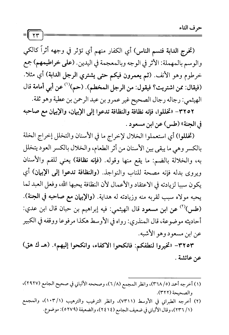 (تخرج الدابة فتسم الناس) أي الكفار منهم أي تؤثر في وجهه أثراً كالكي والوسم بالمهملة: الأثر في الوجه وبالمعجمة في اليدين. (على خراطيمهم) جمع خرطوم وهو الأنف. (ثم يعمرون فيكم حتى يشتري الرجل الدابة) أي مثلا. (فيقال: ممن اشتريت؟ فيقول: من الرجل المخطم). (حم) (¬1) عن أبي أمامة قال الهيثمي: رجاله رجال الصحيح غير عمرو بن عبد الرحمن بن عطية وهو ثقة.