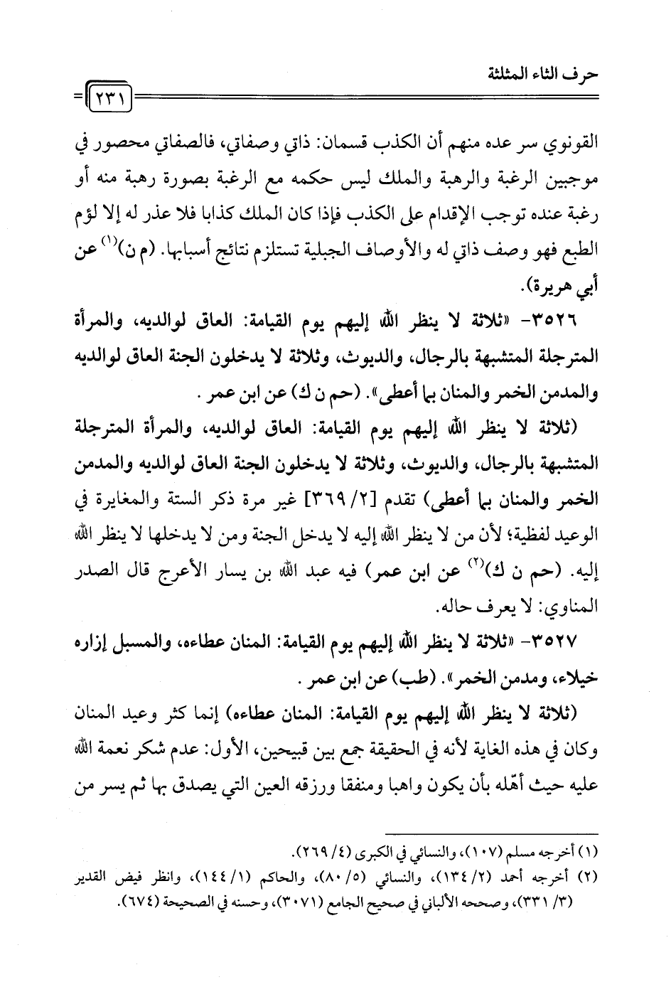 3526 - "ثلاثة لا ينظر الله إليهم يوم القيامة: العاق لوالديه، والمرأة المترجلة المتشبهة بالرجال، والديوث، وثلاثة لا يدخلون الجنة العاق لوالديه والمدمن الخمر والمنان بما أعطى". (حم ن ك) عن ابن عمر.