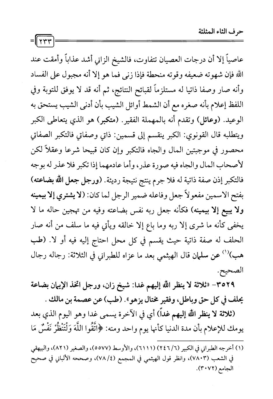 3529 - "ثلاثة لا ينظر الله إليهم غدا: شيخ زان، ورجل اتخذ الإيمان بضاعة يحلف في كل حق وباطل، وفقير مختال يزهو". (طب) عن عصمة بن مالك.