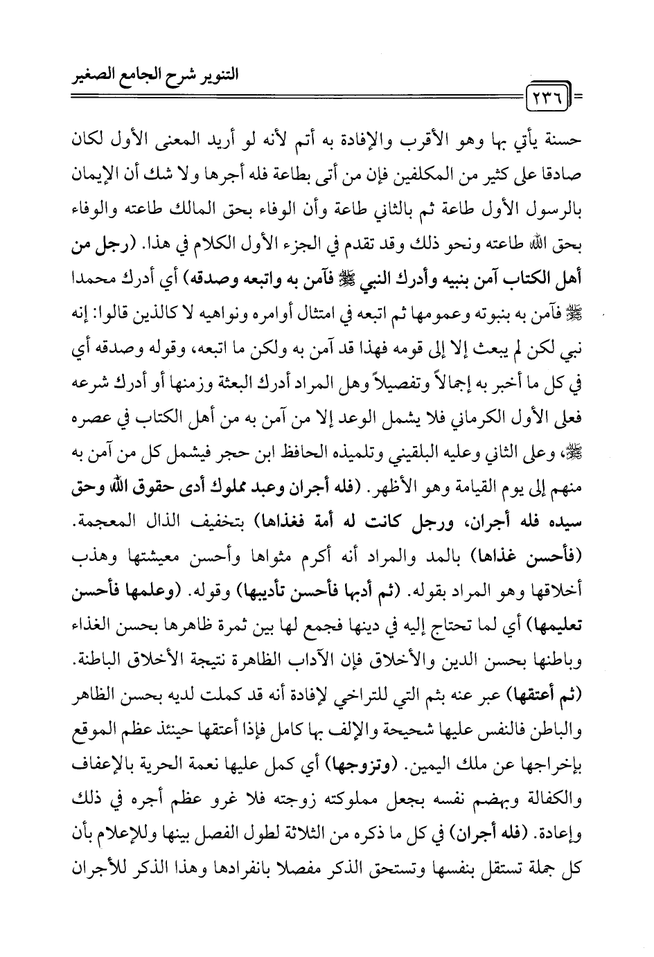 حسنة يأتي بها وهو الأقرب والإفادة به أتم لأنه لو أريد المعنى الأول لكان صادقا على كثير من المكلفين فإن من أتى بطاعة فله أجرها ولا شك أن الإيمان بالرسول الأول طاعة ثم بالثاني طاعة وأن الوفاء بحق المالك طاعته والوفاء بحق الله طاعته ونحو ذلك وقد تقدم في الجزء الأول الكلام في هذا. (رجل من أهل الكتاب آمن بنبيه وأدرك النبي - صلى الله عليه وسلم - فآمن به واتبعه وصدقه) أي أدرك محمدا - صلى الله عليه وسلم - فآمن به بنبوته وعمومها ثم اتبعه في امتثال أوامره ونواهيه لا كالذين قالوا: إنه نبي لكن لم يبعث إلا إلى قومه فهذا قد آمن به ولكن ما اتبعه، وقوله وصدقه أي في كل ما أخبر به إجمالاً وتفصيلاً وهل المراد أدرك البعثة وزمنها أو أدرك شرعه فعلى الأول الكرماني فلا يشمل الوعد إلا من آمن به من أهل الكتاب في عصره - صلى الله عليه وسلم -، وعلى الثاني وعليه البلقيني وتلميذه الحافظ ابن حجر فيشمل كل من آمن به منهم إلى يوم القيامة وهو الأظهر. (فله أجران وعبد مملوك أدى حقوق الله وحق سيده فله أجران، ورجل كانت له أمة فغذاها) بتخفيف الذال المعجمة. (فأحسن غذاها) بالمد والمراد أنه أكرم مثواها وأحسن معيشتها وهذب أخلاقها وهو المراد بقوله. (ثم أدبها فأحسن تأديبها) وقوله. (وعلمها فأحسن تعليمها) أي لما تحتاج إليه في دينها فجمع لها بين ثمرة ظاهرها بحسن الغذاء وباطنها بحسن الدين والأخلاق فإن الآداب الظاهرة نتيجة الأخلاق الباطنة. (ثم أعتقها) عبر عنه بثم التي للتراخي لإفادة أنه قد كملت لديه بحسن الظاهر والباطن فالنفس عليها شحيحة والإلف بها كامل فإذا أعتقها حينئذ عظم الموقع بإخراجها عن ملك اليمين. (وتزوجها) أي كمل عليها نعمة الحرية بالإعفاف والكفالة وبهضم نفسه بجعل مملوكته زوجته فلا غرو عظم أجره في ذلك وإعادة. (فله أجران) في كل ما ذكره من الثلاثة لطول الفصل بينها وللإعلام بأن كل جملة تستقل بنفسها وتستحق الذكر مفصلا بانفرادها وهذا الذكر للأجران