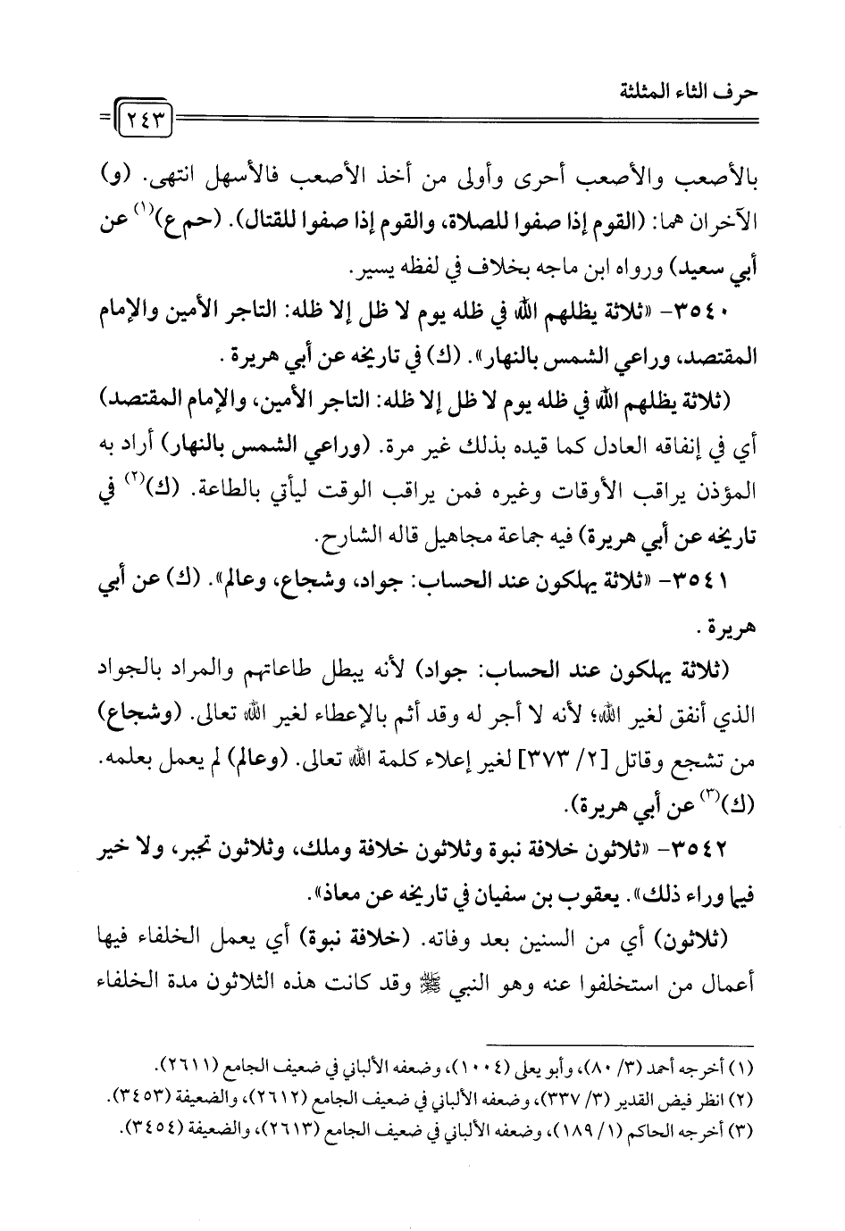 3540 - "ثلاثة يظلهم الله في ظله يوم لا ظل إلا ظله: التاجر الأمين والإمام المقتصد، وراعي الشمس بالنهار". (ك) في تاريخه عن أبي هريرة.