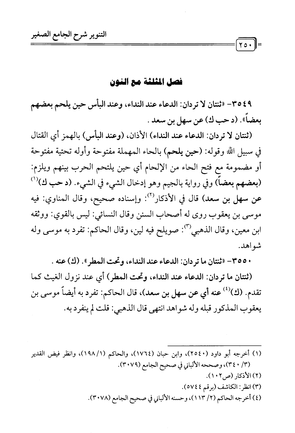 3549 - " ثنتان لا تردان: الدعاء عند النداء، وعند البأس حين يلحم بعضهم بعضاً". (د حب ك) عن سهل بن سعد.