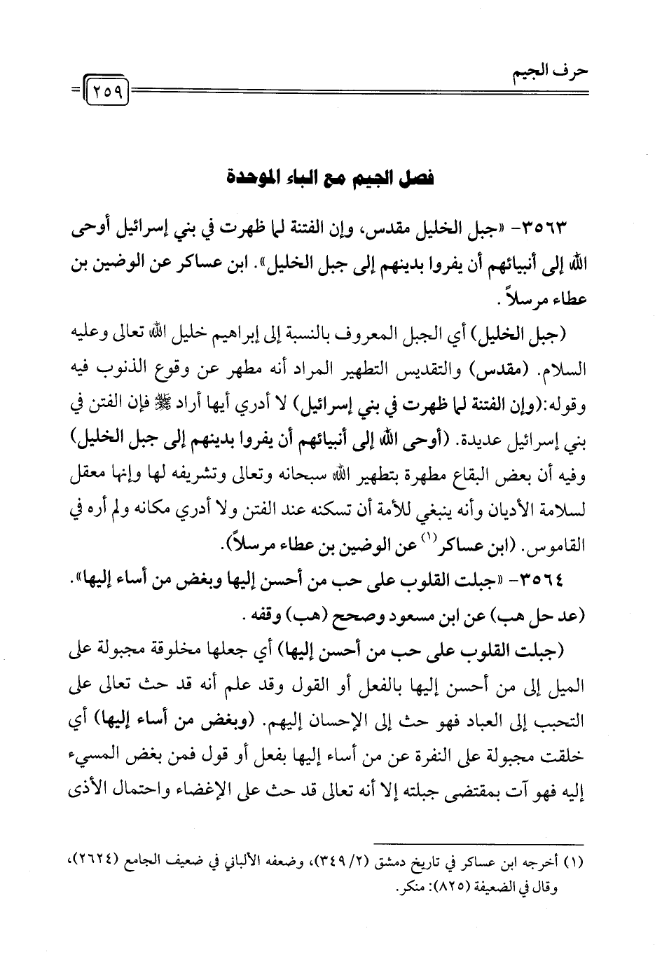 3563 - " جبل الخليل مقدس، وإن الفتنة لما ظهرت في بني إسرائيل أوحى الله إلى أنبيائهم أن يفروا بدينهم إلى جبل الخليل". ابن عساكر عن الوضين بن عطاء مرسلاً.