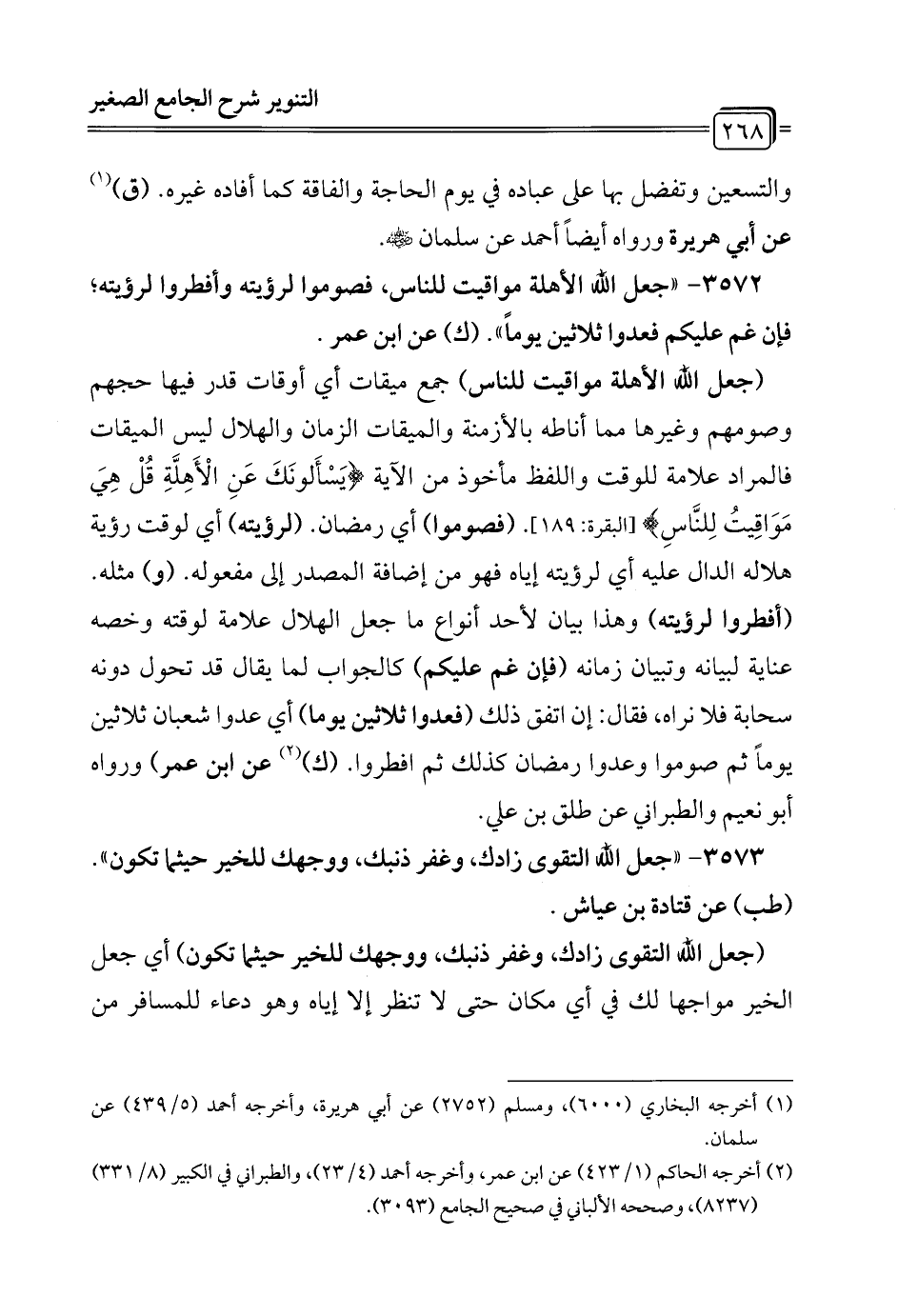 3572 - "جعل الله الأهلة مواقيت للناس، فصوموا لرؤيته وأفطروا لرؤيته؛ فإن غم عليكم فعدوا ثلاثين يوماً". (ك) عن ابن عمر.