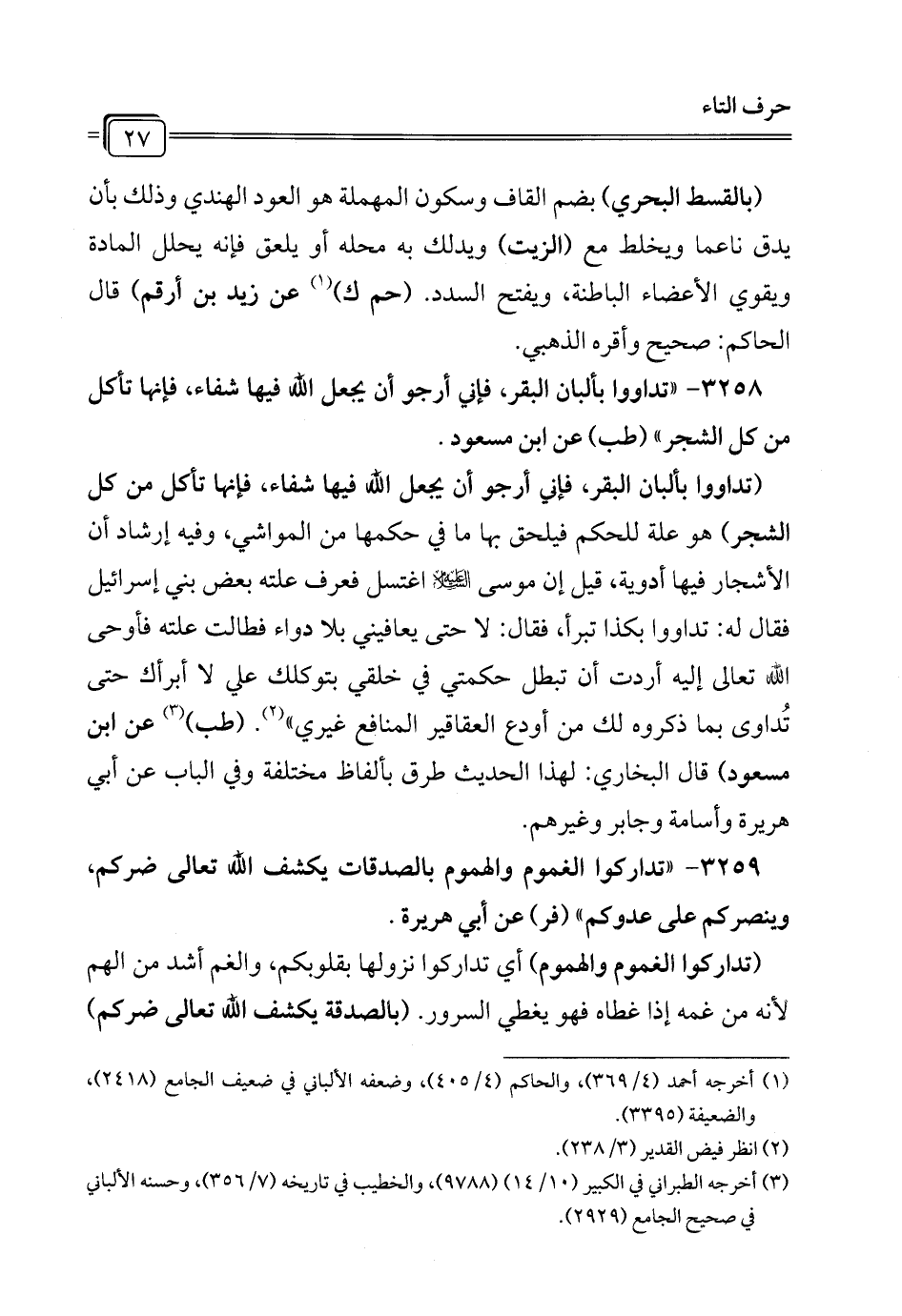 3258 - "تداووا بألبان البقر، فإني أرجو أن يجعل الله فيها شفاء، فإنها تأكل من كل الشجر" (طب) عن ابن مسعود.