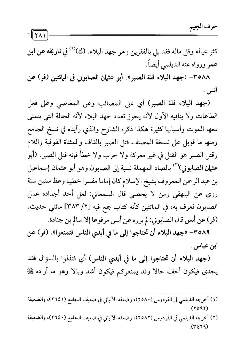 (جهد البلاء قلة الصبر) أي على المصائب وعن المعاصي وعلى فعل الطاعات ولا ينافيه الأول لأنه يجوز تعدد جهد البلاء لأنه الحالة التي يتمنى معها الموت وأسبابها كثيرة هكذا ذكره الشارح والذي رأيناه في نسخ الجامع ومنها ما قوبل على نسخة المصنف قتل الصبر بالقاف والمثناة الفوقية واللام وقتل الصبر هو القتل في غير معركة ولا حرب ولا خطأ فإنه قتل الصبر. (أبو عثمان الصابوني) (¬2) بالصاد المهملة نسبة إلى الصابون وهو أبو عثمان إسماعيل بن عبد الرحمن المعروف بشيخ الإسلام كان إماما مفسرا خطيبا وعظ ستين سنة روى عن البيهقي ومن لا يحصى قال السمعاني: لعل أحد أجداده عمل الصابون فعرف به، في المائتين كأنه كتاب جمع فيه [2/ 383] مائتي حديث. (فر) عن أنس قال الصابوني: لم يروه عن أنس مرفوعا إلا سالم بن جنادة.