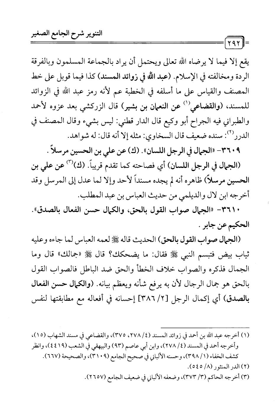 3610 - "الجمال صواب القول بالحق، والكمال حسن الفعال بالصدق". الحكيم عن جابر.