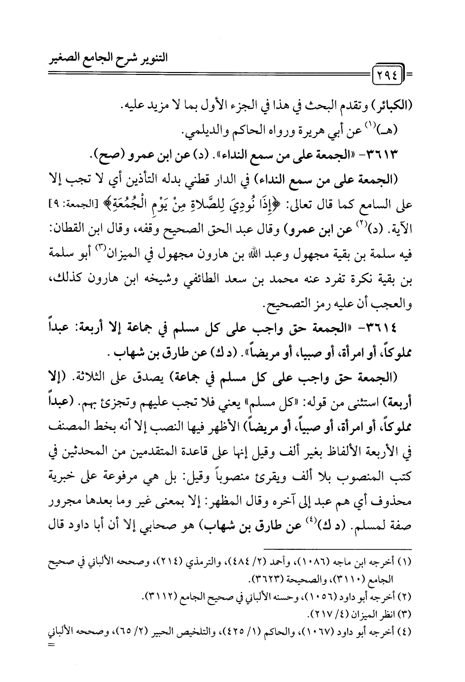 3614 - "الجمعة حق واجب على كل مسلم في جماعة إلا أربعة: عبداً مملوكاً، أو امرأه، أو صبيا، أو مريضاً". (د ك) عن طارق بن شهاب.