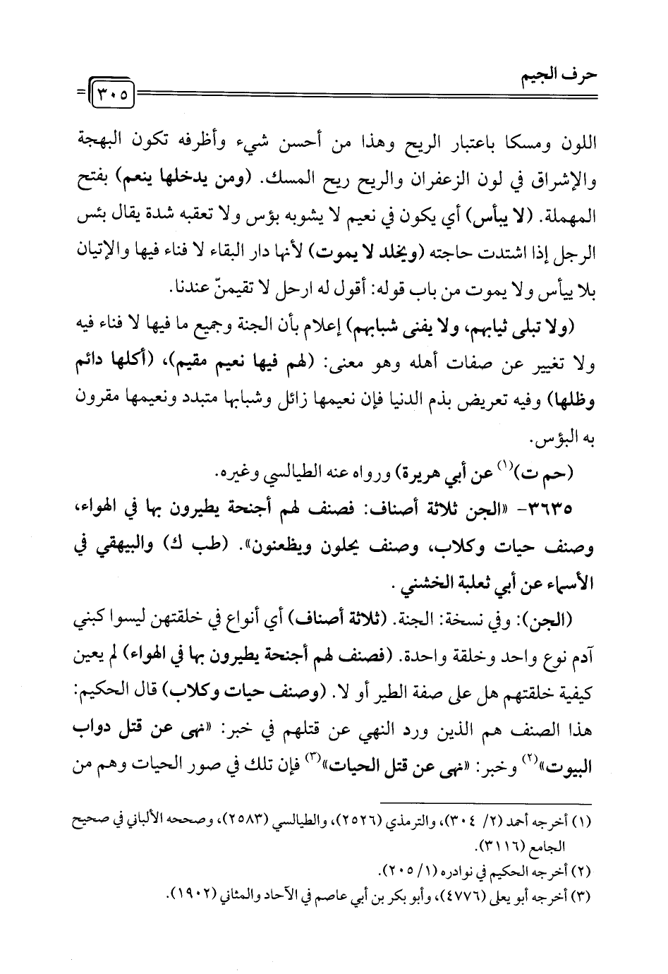 3635 - "الجن ثلاثة أصناف: فصنف لهم أجنحة يطيرون بها في الهواء، وصنف حيات وكلاب، وصنف يحلون ويظعنون". (طب ك) والبيهقي في الأسماء عن أبي ثعلبة الخشني.
