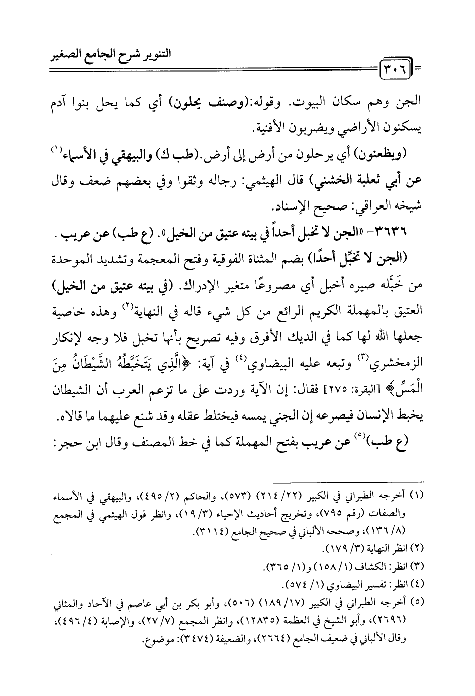 (الجن لا تخبِّل أحدًا) بضم المثناة الفوقية وفتح المعجمة وتشديد الموحدة من خَبَّله صيره أخبل أي مصروعًا متغير الإدراك. (في بيته عتيق من الخيل) العتيق بالمهملة الكريم الرائع من كل شيء قاله في النهاية (¬2) وهذه خاصية جعلها الله لها كما في الديك الأفرق وفيه تصريح بأنها تخبل فلا وجه لإنكار الزمخشري (¬3) وتبعه عليه البيضاوي (¬4) في آية: {الَّذِي يَتَخَبَّطُهُ الشَّيْطَانُ مِنَ الْمَسِّ} [البقرة: 275] فقال: إن الآية وردت على ما تزعم العرب أن الشيطان يخبط الإنسان فيصرعه إن الجني يمسه فيختلط عقله وقد شنع عليهما ما قالاه. (ع طب) (¬5) عن عريب بفتح المهملة كما في خط المصنف وقال ابن حجر:
