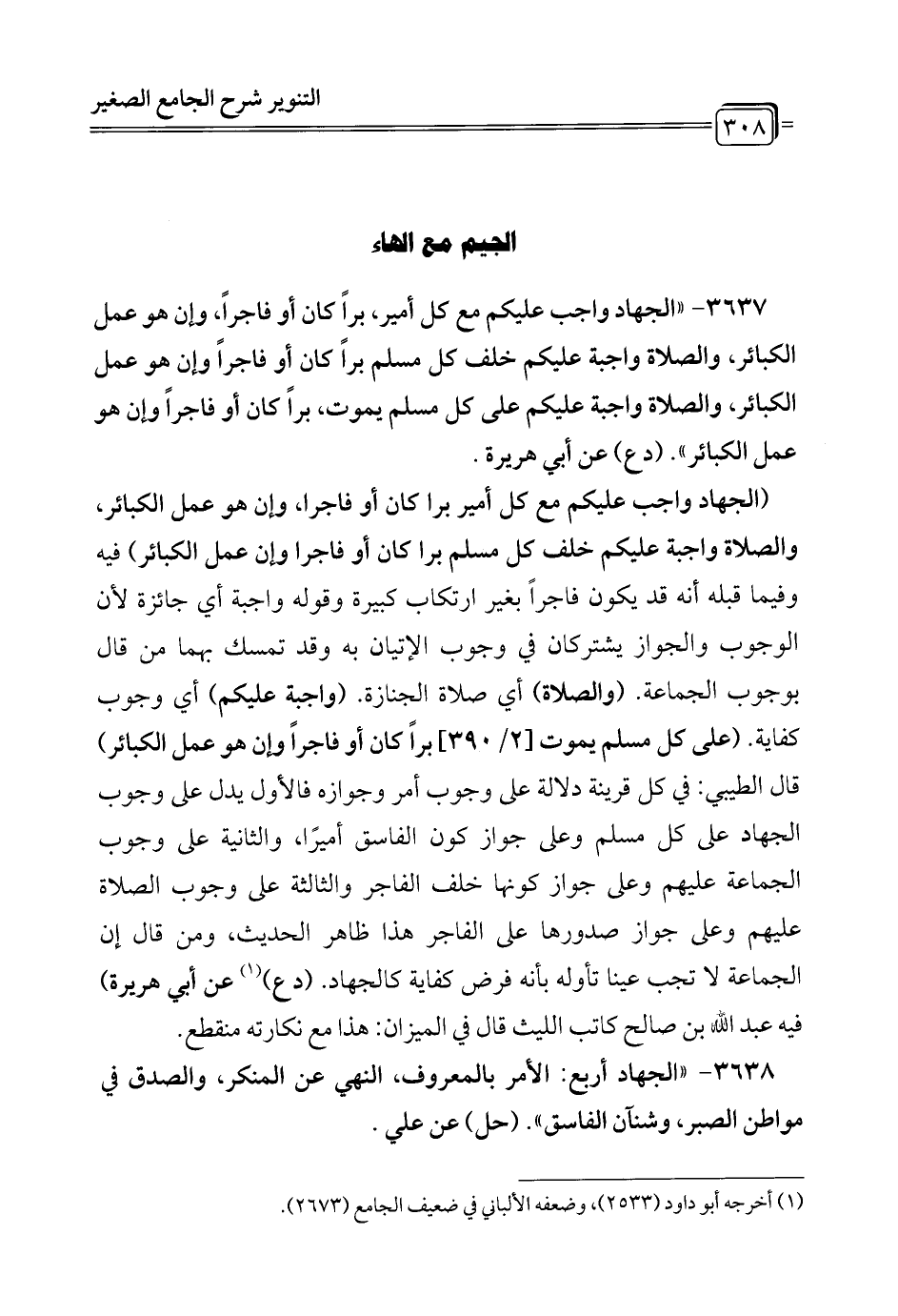 3637 - " الجهاد واجب عليكم مع كل أمير، براً كان أو فاجراً، وإن هو عمل الكبائر، والصلاة واجبة عليكم خلف كل مسلم براً كان أو فاجراً وإن هو عمل الكبائر، والصلاة واجبة عليكم على كل مسلم يموت، براً كان أو فاجراً وإن هو عمل الكبائر". (د ع) عن أبي هريرة.