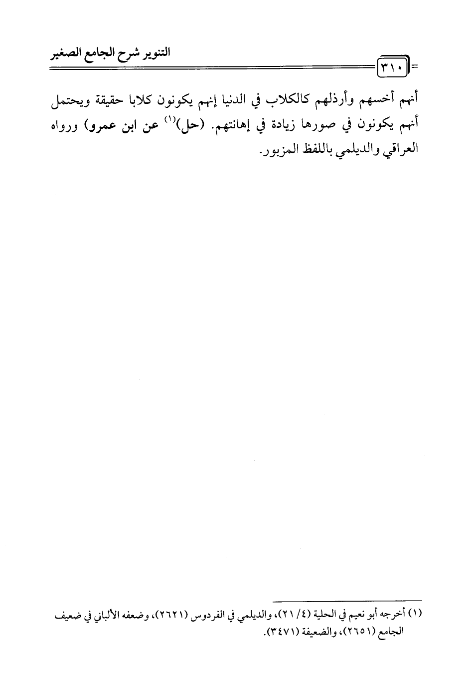 أنهم أخسهم وأرذلهم كالكلاب في الدنيا إنهم يكونون كلابا حقيقة ويحتمل أنهم يكونون في صورها زيادة في إهانتهم. (حل) (¬1) عن ابن عمرو) ورواه العراقي والديلمي باللفظ المزبور.