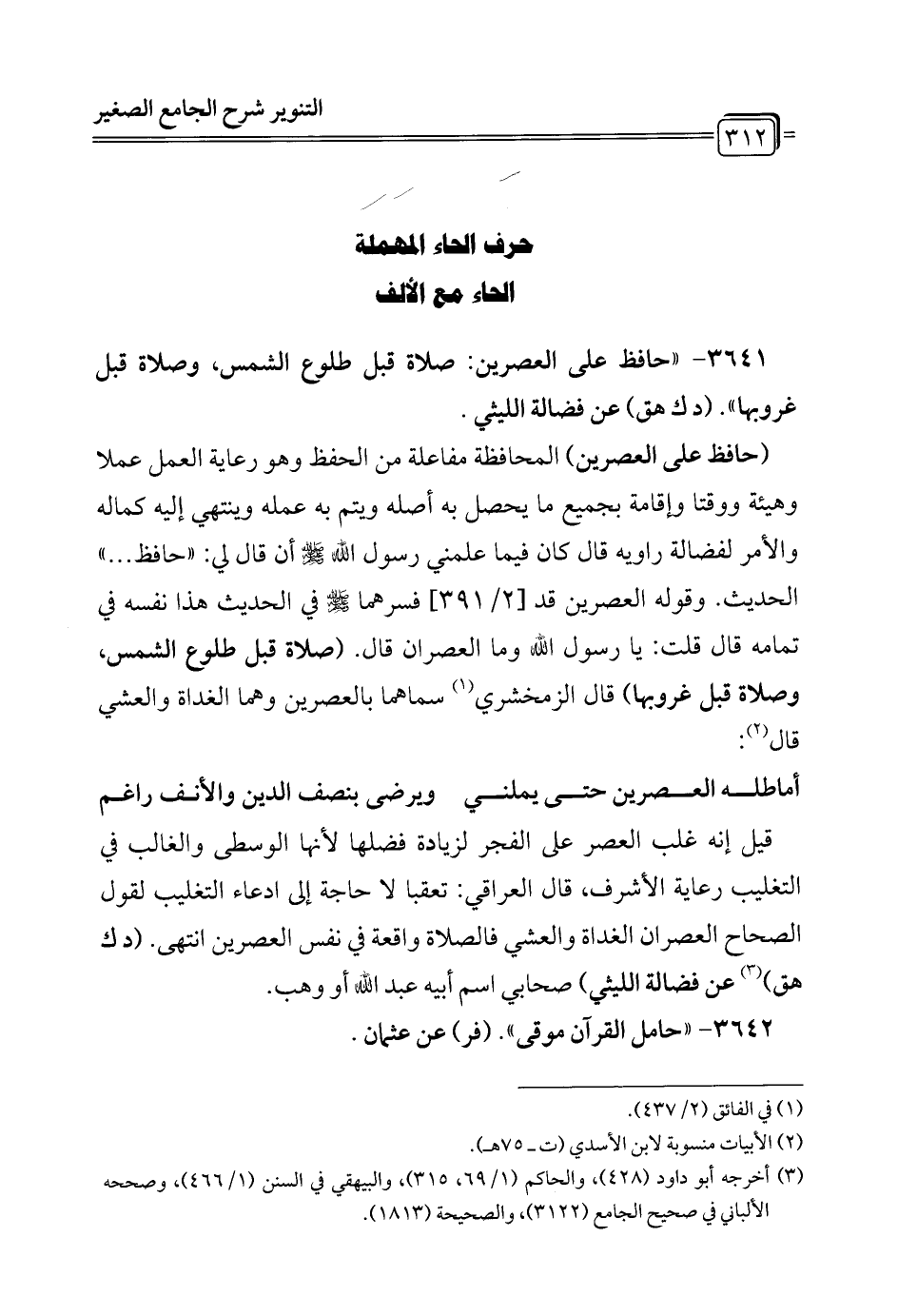 قيل إنه غلب العصر على الفجر لزيادة فضلها لأنها الوسطى والغالب في التغليب رعاية الأشرف، قال العراقي: تعقبا لا حاجة إلى ادعاء التغليب لقول الصحاح العصران الغداة والعشي فالصلاة واقعة في نفس العصرين انتهى. (د ك هق) (¬3) عن فضالة الليثي) صحابي اسم أبيه عبد الله أو وهب.