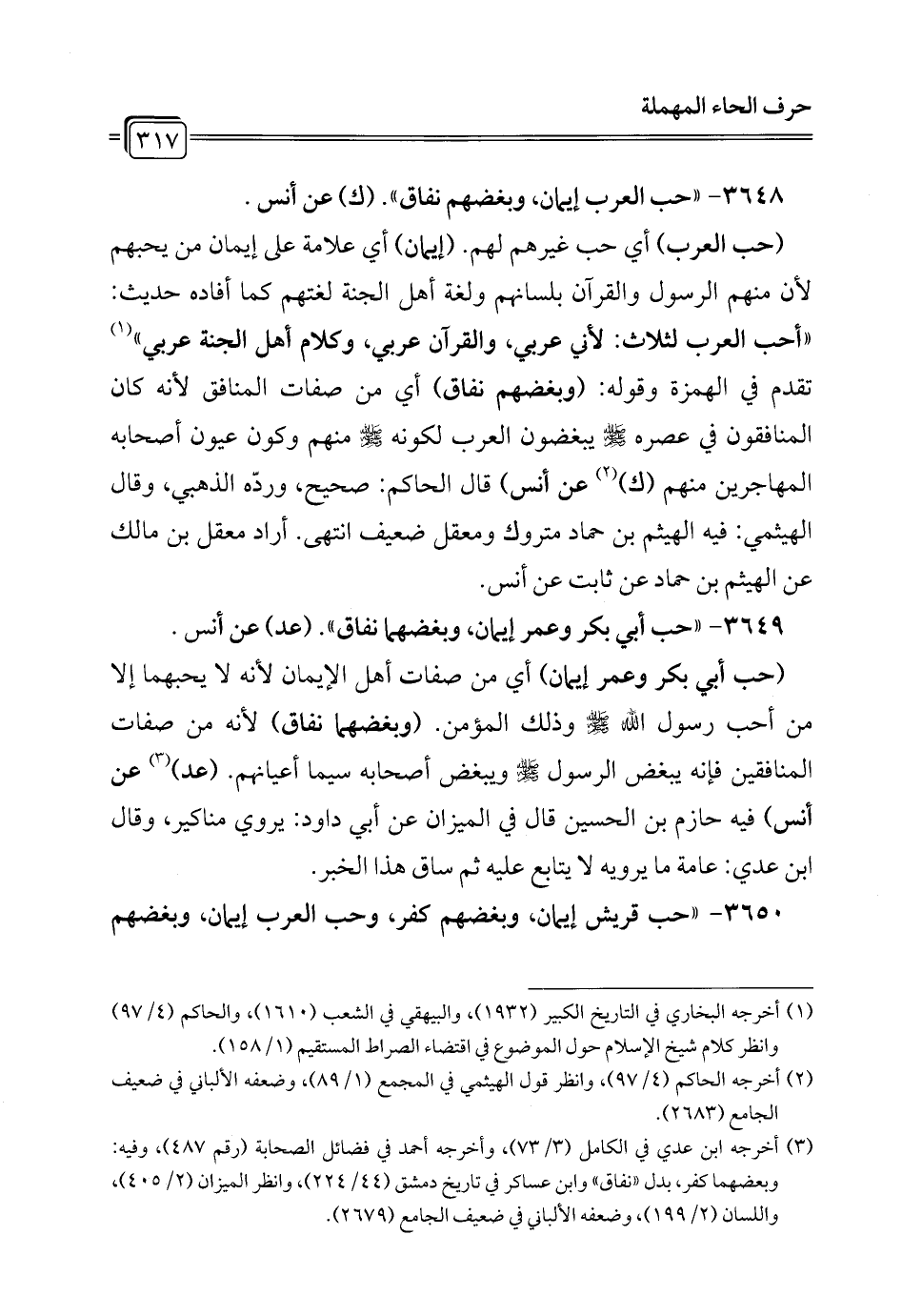 3650 - "حب قريش إيمان، وبغضهم كفر، وحب العرب إيمان، وبغضهم