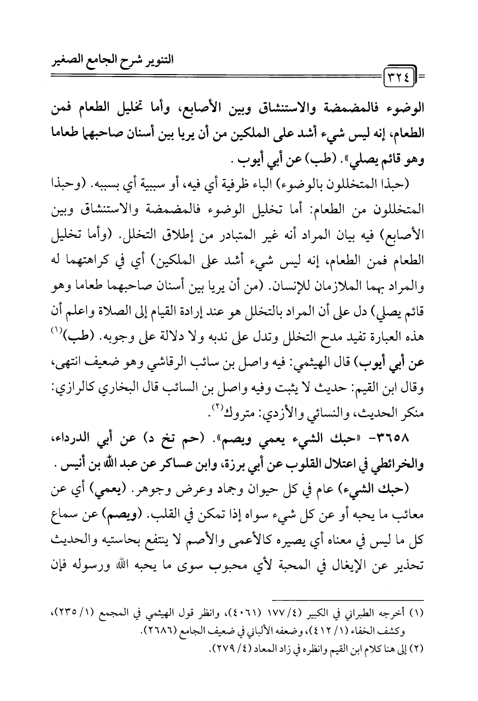(حبذا المتخللون بالوضوء) الباء ظرفية أي فيه، أو سببية أي بسببه. (وحبذا المتخللون من الطعام: أما تخليل الوضوء فالمضمضة والاستنشاق وبين الأصابع) فيه بيان المراد أنه غير المتبادر من إطلاق التخلل. (وأما تخليل الطعام فمن الطعام، إنه ليس شيء أشد على الملكين) أي في كراهتهما له والمراد بهما الملازمان للإنسان. (من أن يريا بين أسنان صاحبهما طعاما وهو قائم يصلي) دل على أن المراد بالتخلل هو عند إرادة القيام إلى الصلاة واعلم أن هذه العبارة تفيد مدح التخلل وتدل على ندبه ولا دلالة على وجوبه. (طب) (¬1) عن أبي أيوب) قال الهيثمي: فيه واصل بن سائب الرقاشي وهو ضعيف انتهى، وقال ابن القيم: حديث لا يثبت وفيه واصل بن السائب قال البخاري كالرازي: منكر الحديث، والنسائي والأزدي: متروك (¬2).
