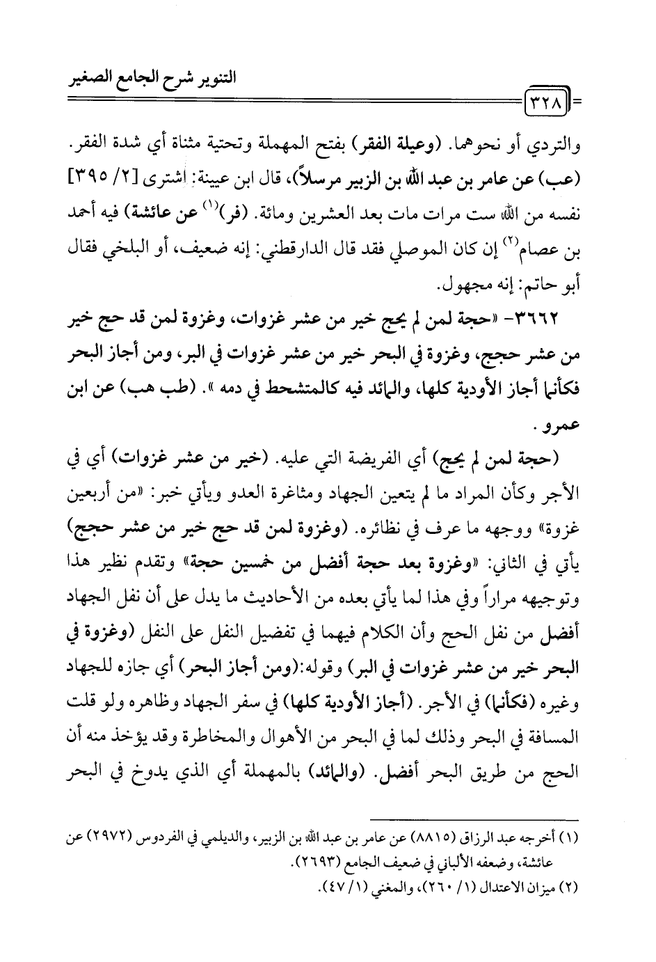 3662 - "حجة لمن لم يحج خير من عشر غزوات وغزوة لمن قد حج خير من عشر حجج، وغزوة في البحر خير من عشر غزوات في البر، ومن أجاز البحر فكأنما أجاز الأودية كلها، والمائد فيه كالمتشحط في دمه". (طب هب) عن ابن عمرو.