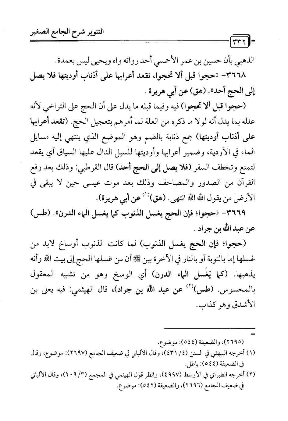 3668 - "حجوا قبل ألا تحجوا، تقعد أعرابها على أذناب أوديتها فلا يصل إلى الحج أحد". (هق) عن أبي هريرة.
