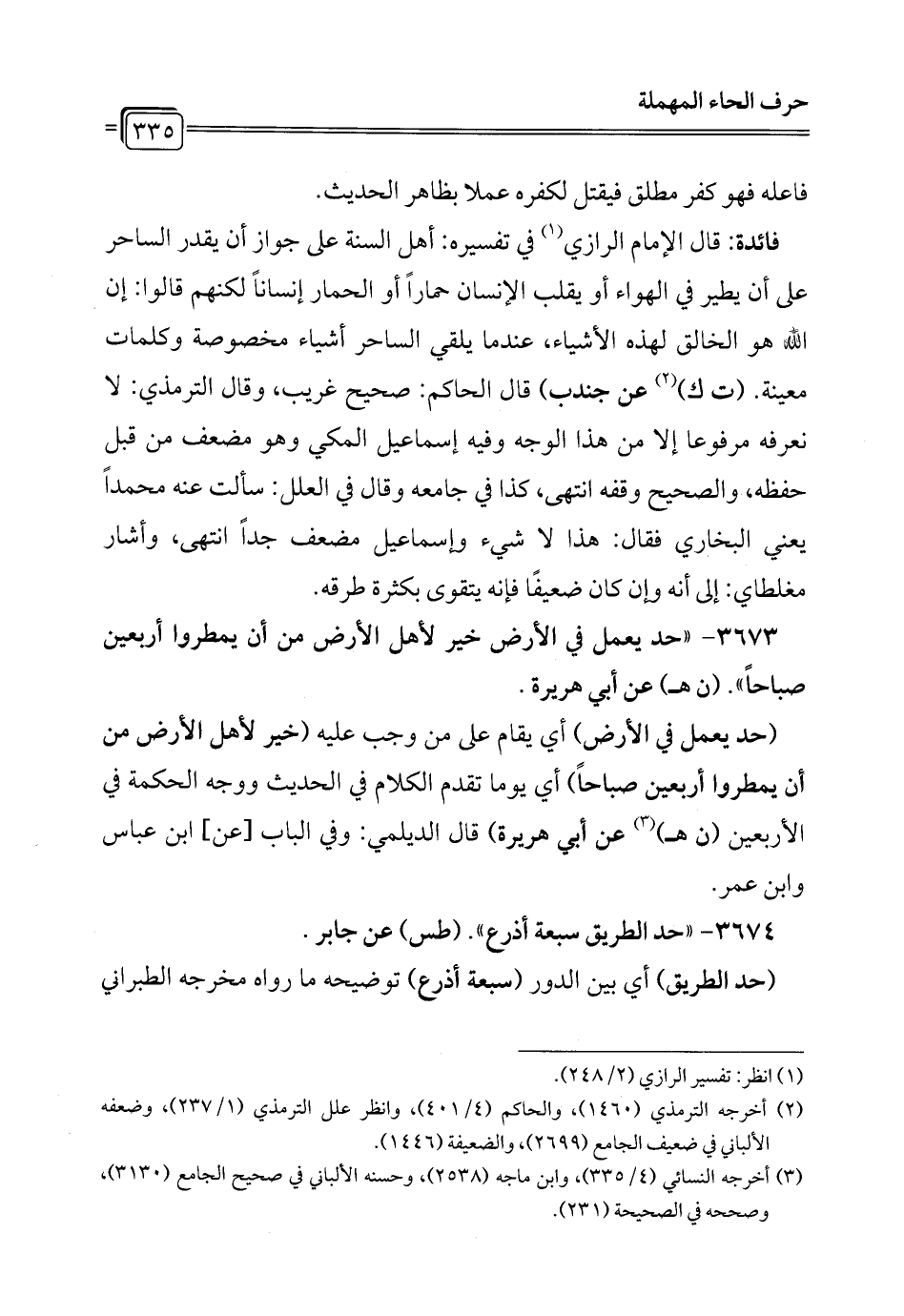 فائدة: قال الإمام الرازي (¬1) في تفسيره: أهل السنة على جواز أن يقدر الساحر على أن يطير في الهواء أو يقلب الإنسان حماراً أو الحمار إنساناً لكنهم قالوا: إن الله هو الخالق لهذه الأشياء، عندما يلقي الساحر أشياء مخصوصة وكلمات معينة. (ت ك) (¬2) عن جندب) قال الحاكم: صحيح غريب، وقال الترمذي: لا نعرفه مرفوعا إلا من هذا الوجه وفيه إسماعيل المكي وهو مضعف من قبل حفظه، والصحيح وقفه انتهى، كذا في جامعه وقال في العلل: سألت عنه محمداً يعني البخاري فقال: هذا لا شيء وإسماعيل مضعف جداً انتهى، وأشار مغلطاي: إلى أنه وإن كان ضعيفًا فإنه يتقوى بكثرة طرقه.