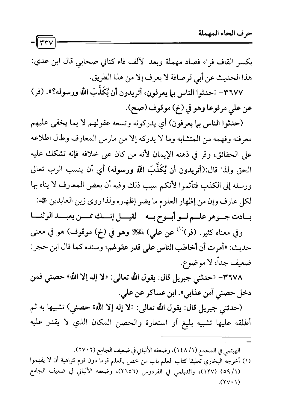 3677 - "حدثوا الناس بما يعرفون، أتريدون أن يُكَذَّبَ الله ورسوله؟ ". (فر) عن علي مرفوعا وهو في (خ) موقوف (صح).