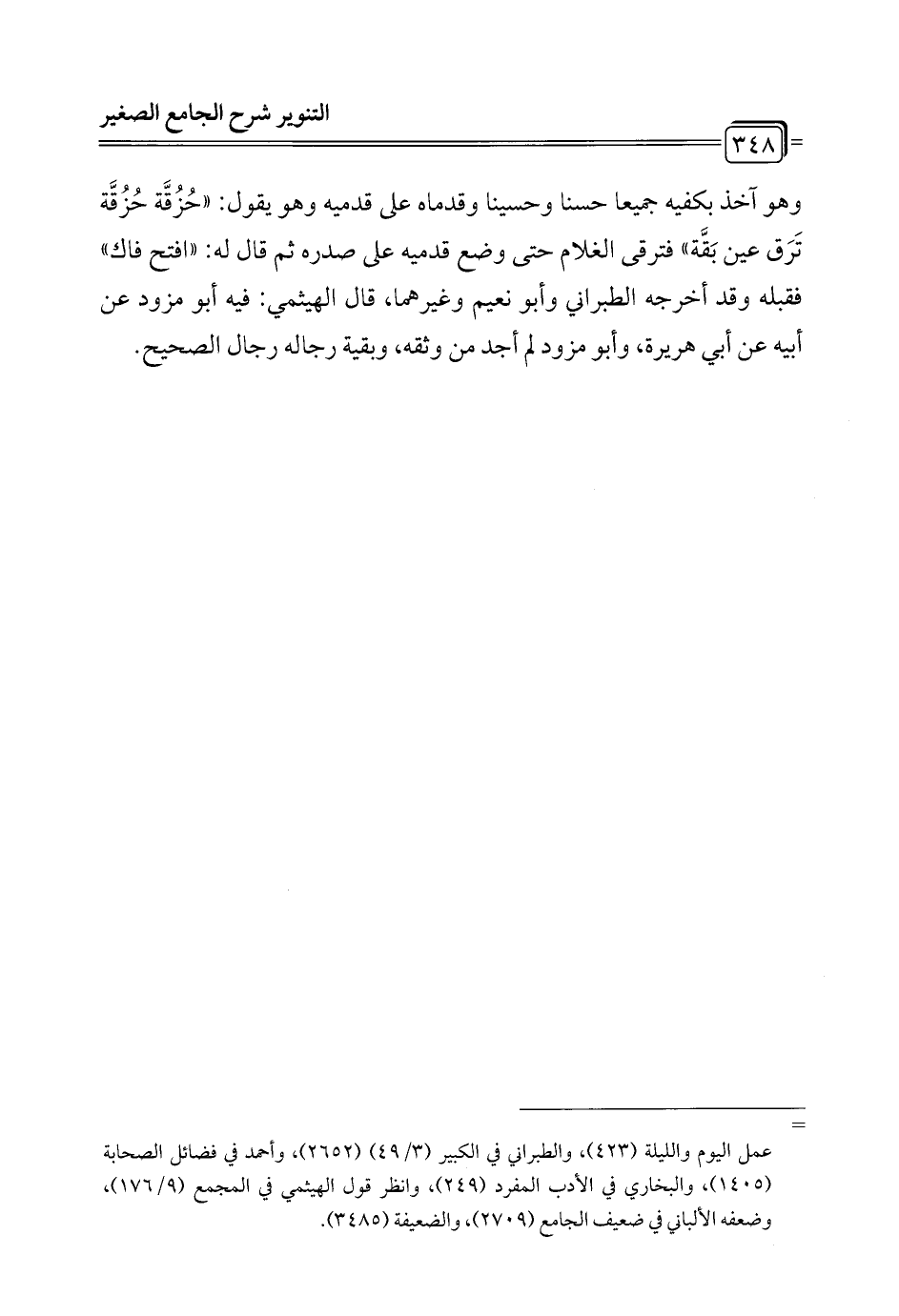 وهو آخذ بكفيه جميعا حسنا وحسينا وقدماه على قدميه وهو يقول: "حُزُقَّة حُزُقَّة تَرَق عين بَقَّة" فترقى الغلام حتى وضع قدميه على صدره ثم قال له: "افتح فاك" فقبله وقد أخرجه الطبراني وأبو نعيم وغيرهما، قال الهيثمي: فيه أبو مزود عن أبيه عن أبي هريرة، وأبو مزود لم أجد من وثقه، وبقية رجاله رجال الصحيح.