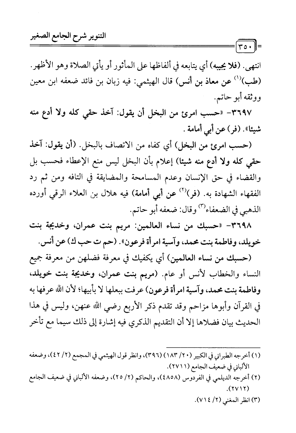 3698 - "حسبك من نساء العالمين: مريم بنت عمران، وخديجة بنت خويلد، وفاطمة بنت محمد، وآسية امرأة فرعون". (حم ت حب ك) عن أنس.