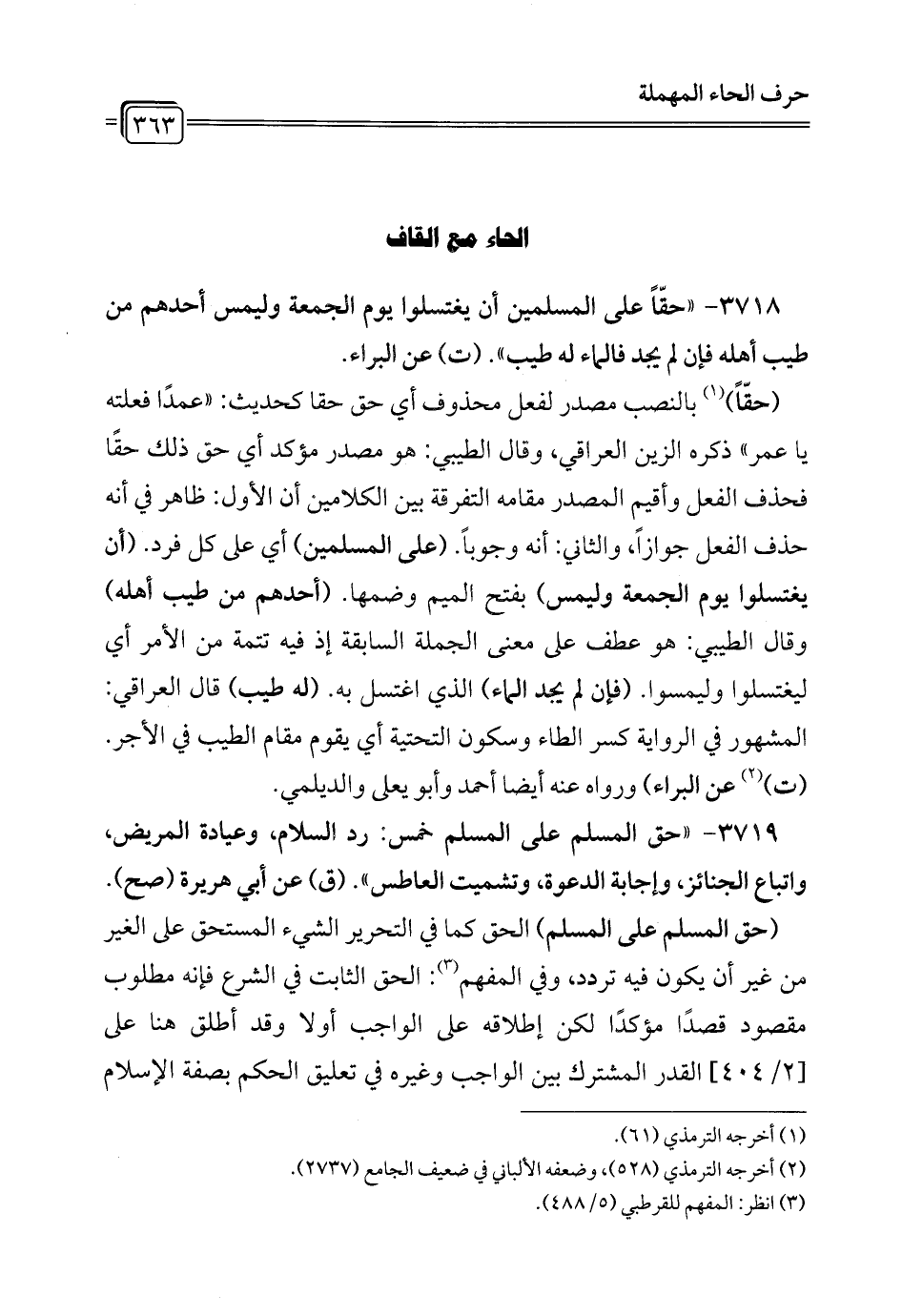 (حقًّا) (¬1) بالنصب مصدر لفعل محذوف أي حق حقا كحديث: "عمدًا فعلته يا عمر" ذكره الزين العراقي، وقال الطيبي: هو مصدر مؤكد أي حق ذلك حقًا فحذف الفعل وأقيم المصدر مقامه التفرقة بين الكلامين أن الأول: ظاهر في أنه حذف الفعل جوازاً، والثاني. أنه وجوباً. (على المسلمين) أي على كل فرد. (أن يغتسلوا يوم الجمعة وليمس) بفتح الميم وضمها. (أحدهم من طيب أهله) وقال الطيبي: هو عطف على معنى الجملة السابقة إذ فيه تتمة من الأمر أي ليغتسلوا وليمسوا. (فإن لم يجد الماء) الذي اغتسل به. (له طيب) قال العراقي: المشهور في الرواية كسر الطاء وسكون التحتية أي يقوم مقام الطيب في الأجر. (ت) (¬2) عن البراء) ورواه عنه أيضا أحمد وأبو يعلى والديلمي.