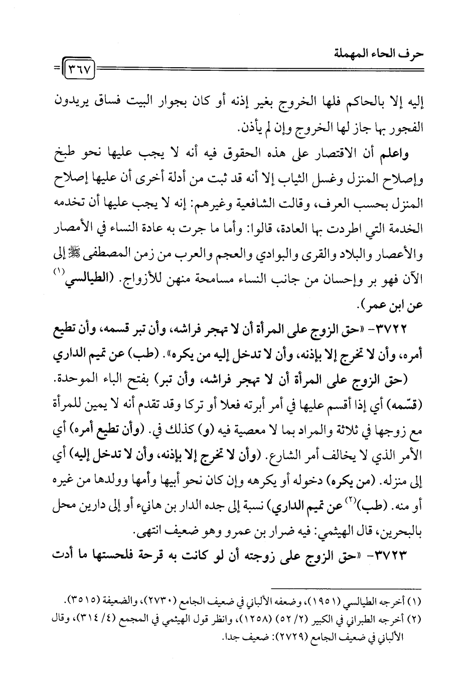 3722 - "حق الزوج على المرأة أن لا تهجر فراشه، وأن تبر قسمه، وأن تطيع أمره، وأن لا تخرج إلا بإذنه، وأن لا تدخل إليه من يكره". (طب) عن تميم الداري