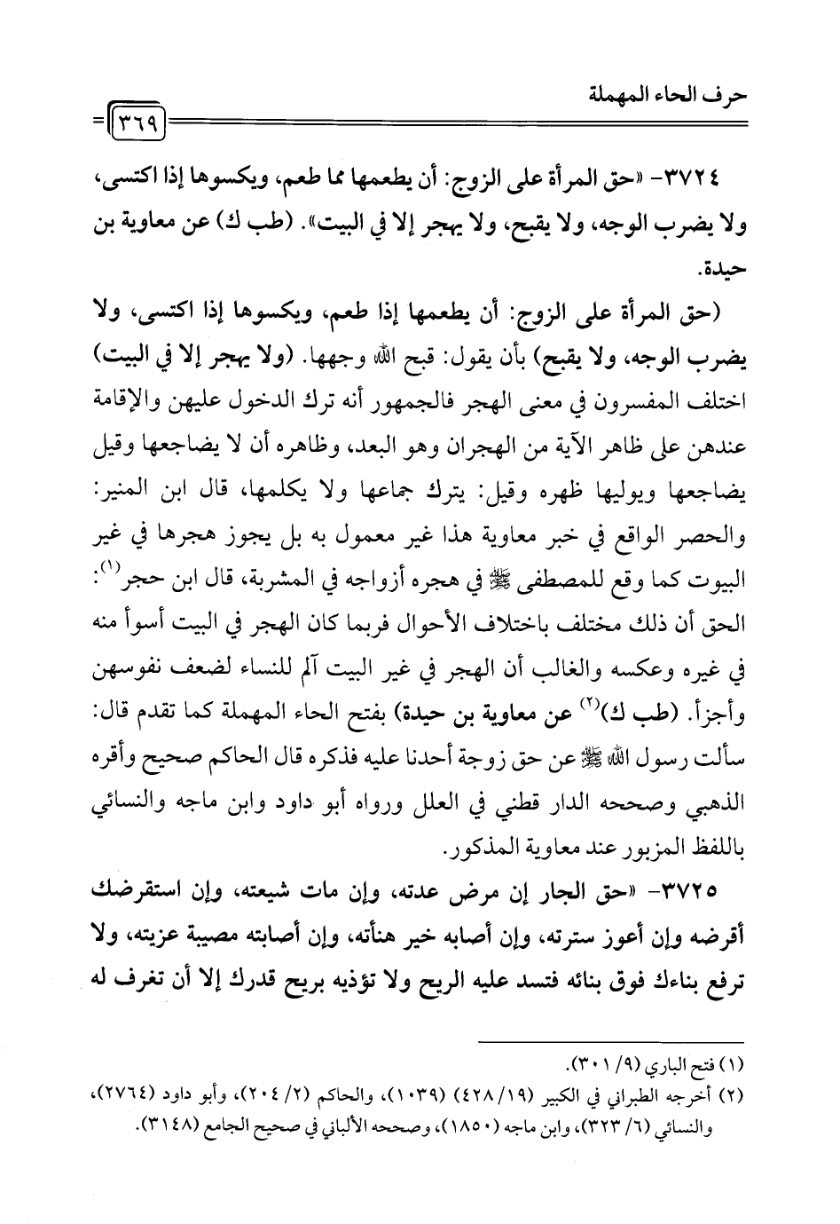3724 - "حق المرأة على الزوج: أن يطعمها مما طعم، ويكسوها إذا اكتسى، ولا يضرب الوجه، ولا يقبح، ولا يهجر إلا في البيت". (طب ك) عن معاوية بن حيدة.