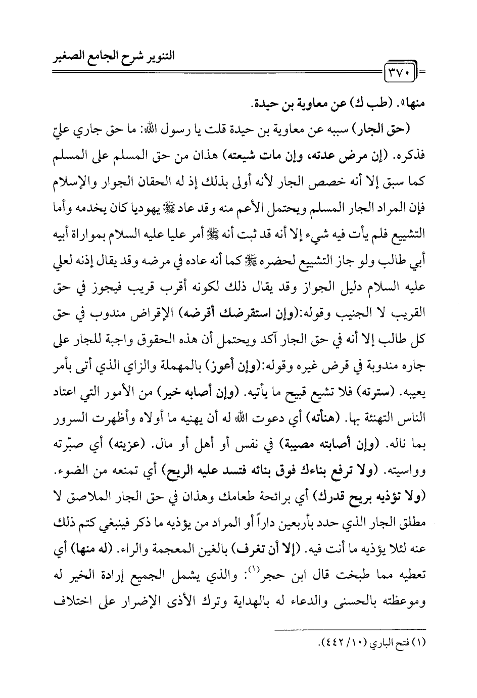 (حق الجار) سببه عن معاوية بن حيدة قلت يا رسول الله: ما حق جاري عليّ فذكره. (إن مرض عدته، وإن مات شيعته) هذان من حق المسلم على المسلم كما سبق إلا أنه خصص الجار لأنه أولى بذلك إذ له الحقان الجوار والإِسلام فإن المراد الجار المسلم ويحتمل الأعم منه وقد عاد - صلى الله عليه وسلم - يهوديا كان يخدمه وأما التشييع فلم يأت فيه شيء إلا أنه قد ثبت أنه - صلى الله عليه وسلم - أمر عليا عليه السلام بمواراة أبيه أبي طالب ولو جاز التشييع لحضره - صلى الله عليه وسلم - كما أنه عاده في مرضه وقد يقال إذنه لعلي عليه السلام دليل الجواز وقد يقال ذلك لكونه أقرب قريب فيجوز في حق القريب لا الجنب وقوله: (وإن استقرضك أقرضه) الإقراض مندوب في حق كل طالب إلا أنه في حق الجار آكد ويحتمل أن هذه الحقوق واجبة للجار على جاره مندوبة في قرض غيره وقوله: (وإن أعوز) بالمهملة والزاي الذي أتى بأمر يعيبه. (سترته) فلا تشيع قبيح ما يأتيه. (وإن أصابه خير) من الأمور التي اعتاد الناس التهنئة بها. (هنأته) أي دعوت الله له أن يهنيه ما أولاه وأظهرت السرور بما ناله. (وإن أصابته مصيبة) في نفس أو أهل أو مال. (عزيته) أي صبّرته وواسيته. (ولا ترفع بناءك فوق بنائه فتسد عليه الريح) أي تمنعه من الضوء. (ولا تؤذيه بريح قدرك) أي برائحة طعامك وهذان في حق الجار الملاصق لا مطلق الجار الذي حدد بأربعين داراً أو المراد من يؤذيه ما ذكر فينبغي كتم ذلك عنه لئلا يؤذيه ما أنت فيه. (إلا أن تغرف) بالغين المعجمة والراء. (له منها) أي تعطيه مما طبخت قال ابن حجر (¬1): والذي يشمل الجميع إرادة الخير له وموعظته بالحسنى والدعاء له بالهداية وترك الأذى الإضرار على اختلاف