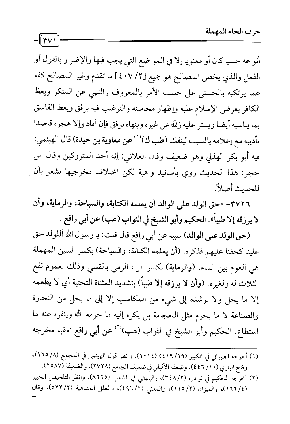 3726 - "حق الولد على الوالد أن يعلمه الكتابة، والسباحة، والرماية، وأن لا يرزقه إلا طيباً". الحكيم وأبو الشيخ في الثواب (هب) عن أبي رافع.