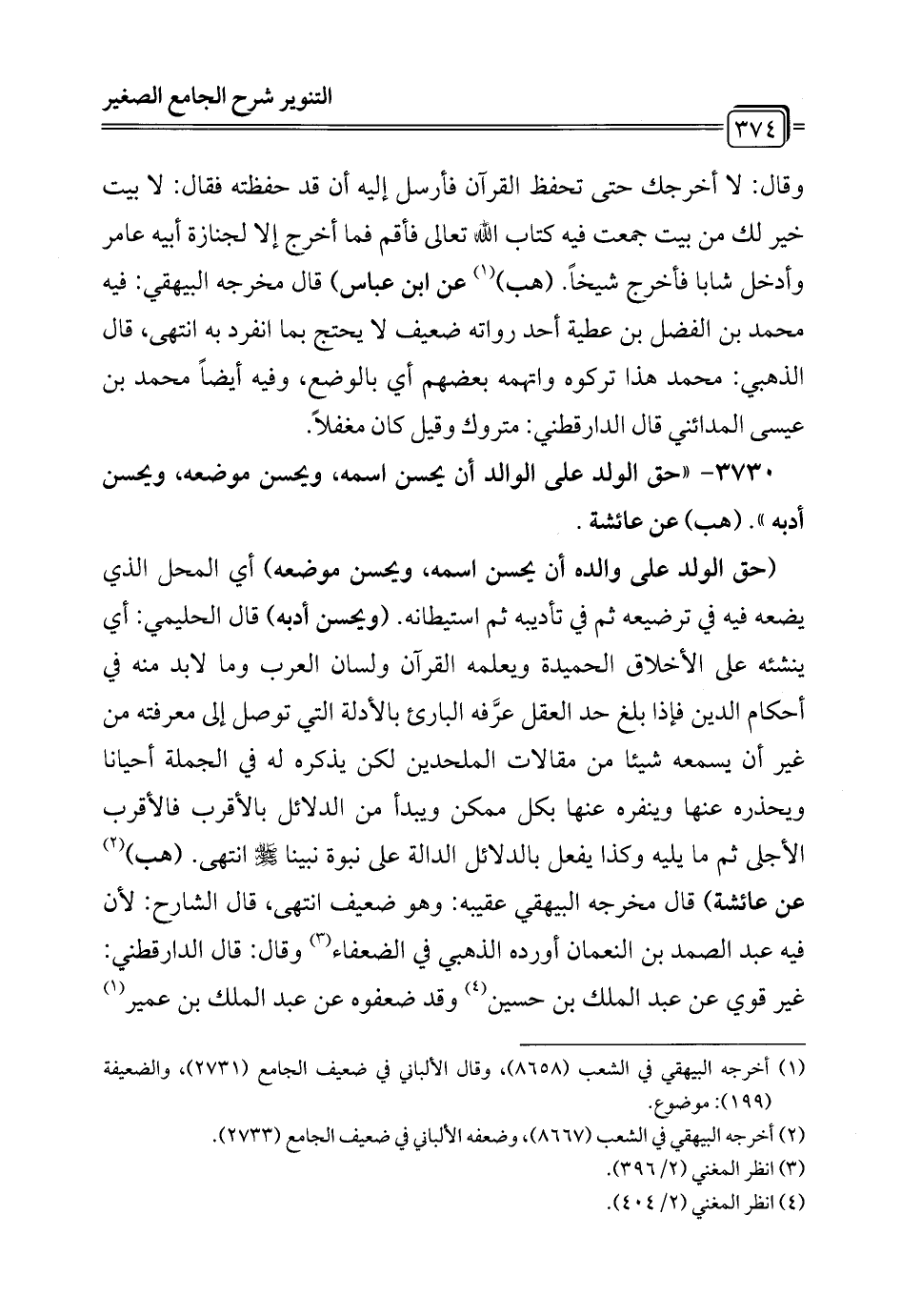 3730 - "حق الولد على الوالد أن يحسن اسمه، ويحسن موضعه، ويحسن أدبه". (هب) عن عائشة.
