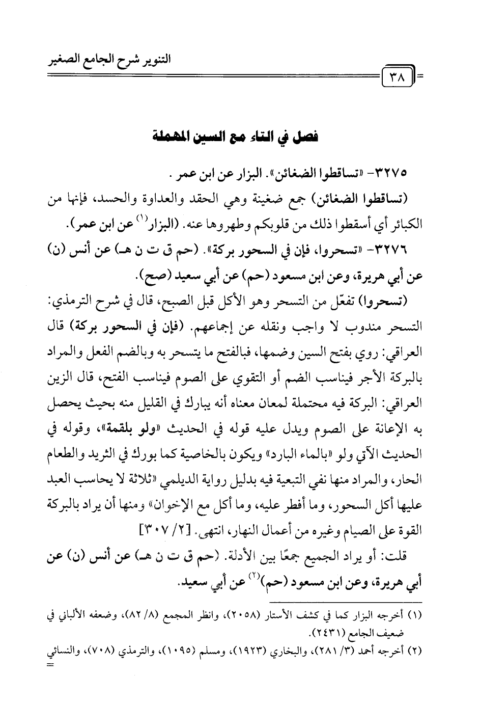 3276 - "تسحروا، فإن في السحور بركة" (حم ق ن هـ) عن أنس (ن) عن أبي هريرة، وعن ابن مسعود (حم) عن أبي سعيد (صح).
