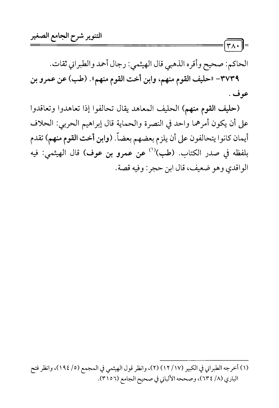 3739 - "حليف القوم منهم، وابن أخت القوم منهم". (طب) عن عمرو بن عوف.