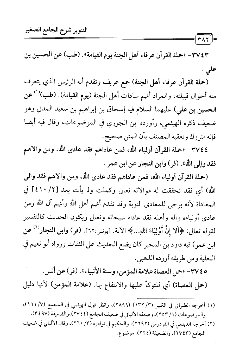 3743 - "حملة القرآن عرفاء أهل الجنة يوم القيامة". (طب) عن الحسين بن علي.