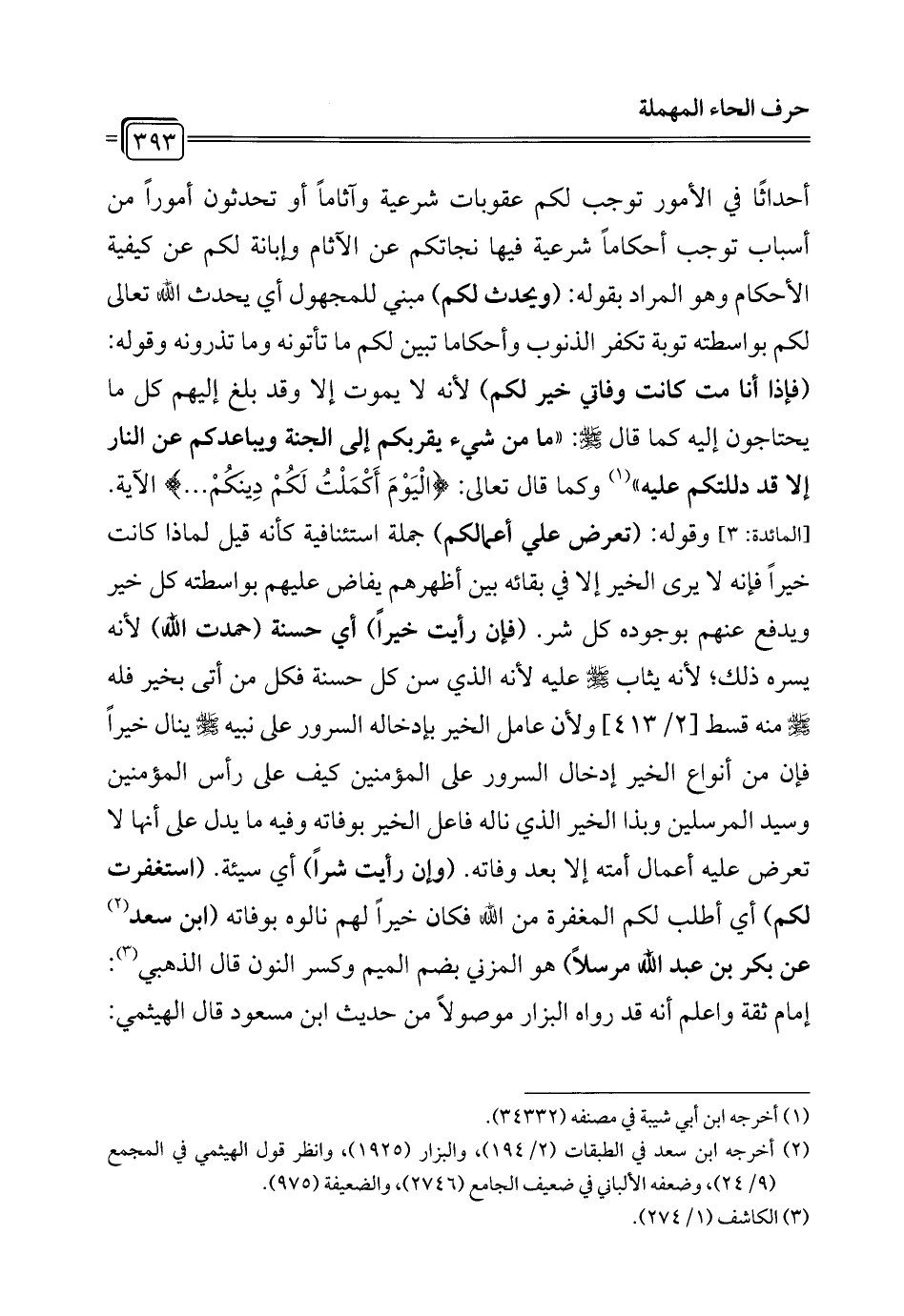 أحداثًا في الأمور توجب لكم عقوبات شرعية وآثاماً أو تحدثون أموراً من أسباب توجب أحكامًا شرعية فيها نجاتكم عن الآثام وإبانة لكم عن كيفية الأحكام وهو المراد بقوله: (ويحدث لكم) مبني للمجهول أي يحدث الله تعالى لكم بواسطته توبة تكفر الذنوب وأحكاما تبين لكم ما تأتونه وما تذرونه وقوله: (فإذا أنا مت كانت وفاتي خير لكم) لأنه لا يموت إلا وقد بلغ إليهم كل ما يحتاجون إليه كما قال - صلى الله عليه وسلم -: "ما من شيء يقربكم إلى الجنة ويباعدكم عن النار إلا قد دللتكم عليه" (¬1) وكما قال تعالى: {الْيَوْمَ أَكْمَلْتُ لَكُمْ دِينَكُمْ} الآية. [المائدة: 3] وقوله: (تعرض علي أعمالكم) جملة استئنافية كأنه قيل لماذا كانت خيراً فإنه لا يرى الخير إلا في بقائه بين أظهرهم يفاض عليهم بواسطته كل خير ويدفع عنهم بوجوده كل شر. (فإن رأيت خيراً) أي حسنة (حمدت الله) لأنه يسره ذلك؛ لأنه يثاب - صلى الله عليه وسلم - عليه لأنه الذي سن كل حسنة فكل من أتى بخير فله - صلى الله عليه وسلم - منه قسط ولأن عامل الخير بإدخاله السرور على نبيه - صلى الله عليه وسلم - ينال خيراً فإن من أنواع الخير إدخال السرور على المؤمنين كيف على رأس المؤمنين وسيد المرسلين وبذا الخير الذي ناله فاعل الخير بوفاته وفيه ما يدل على أنها لا تعرض عليه أعمال أمته إلا بعد وفاته. (وإن رأيت شراً) أي سيئة. (استغفرت لكم) أي أطلب لكم المغفرة من الله فكان خيراً لهم نالوه بوفاته (ابن سعد (¬2) عن بكر بن عبد الله مرسلاً) هو المزني بضم الميم وكسر النون قال الذهبي (¬3): إمام ثقة واعلم أنه قد رواه البزار موصولاً من حديث ابن مسعود قال الهيثمي: