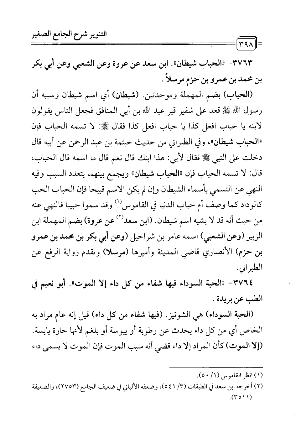 3763 - "الحباب شيطان". ابن سعد عن عروة وعن الشعبي وعن أبي بكر بن محمَّد بن عمرو بن حزم مرسلاً.
