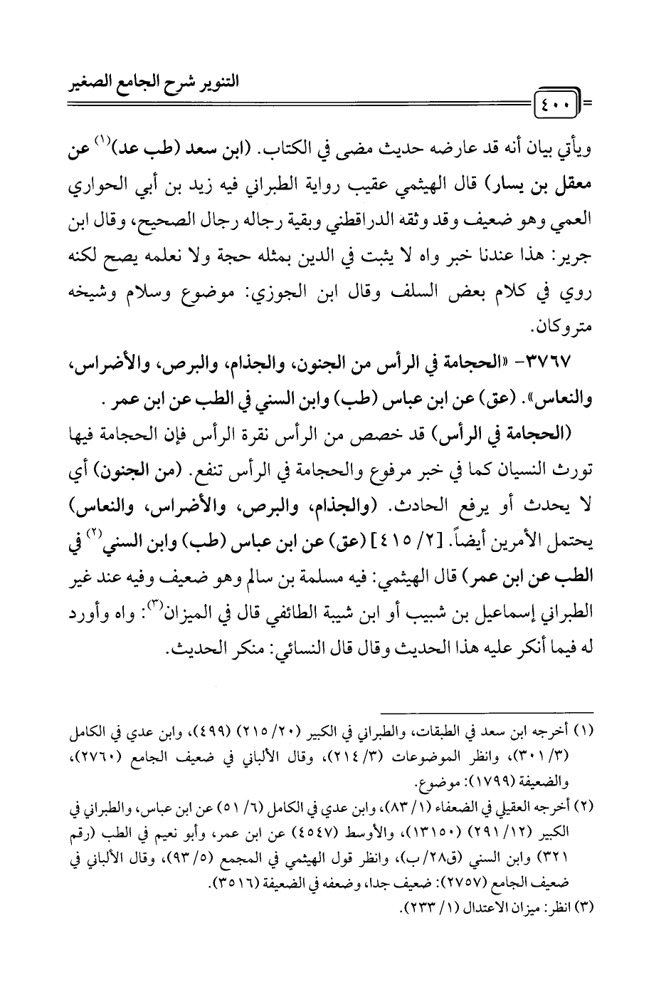 3767 - "الحجامة في الرأس من الجنون، والجذام، والبرص، والأضراس، والنعاس". (عق) عن ابن عباس (طب) وابن السني في الطب عن ابن عمر.